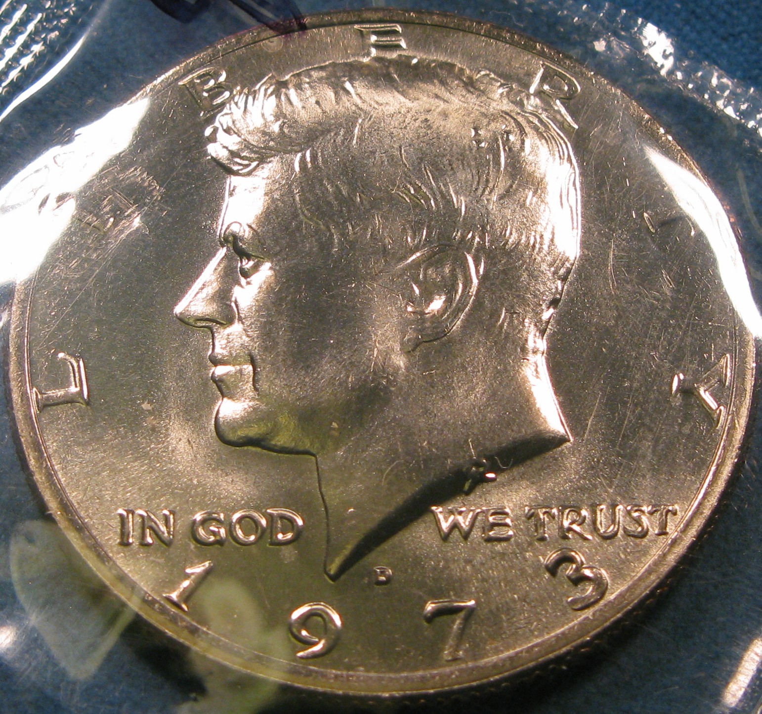 1973D Kennedy half dollar minted in nickel clad copper core metal content. Coin will come in the orginal wrapper from the mint, or a paper, vinyl, or mylar, or a 100% archival quality plastic coin edge holder.