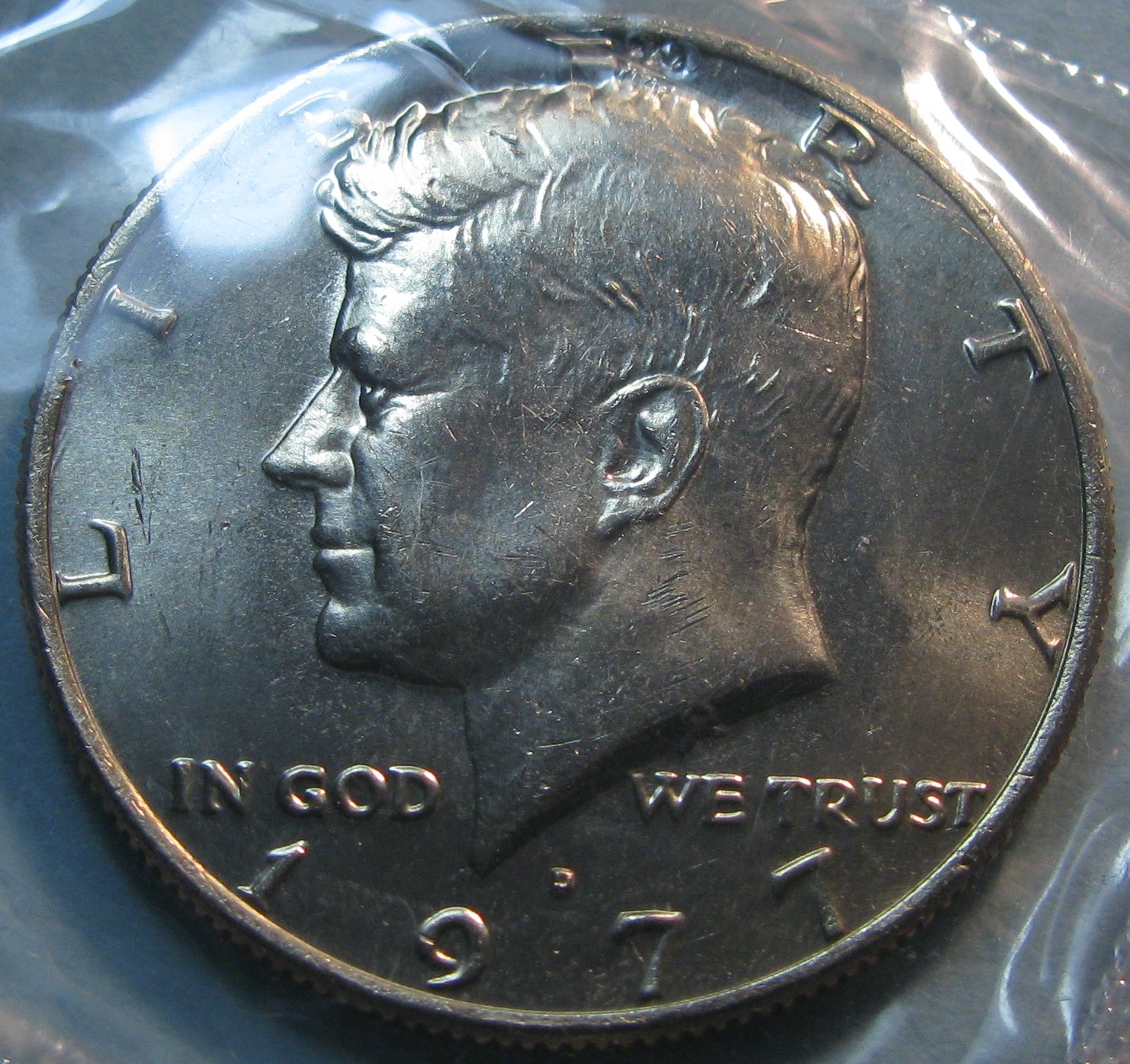 | 1977D Kennedy half dollar minted in nickel clad copper core metal content.  Coin will come in the orginal wrapper from the mint, or a paper, or a mylar, or a 100% archival quality plastic coin edge holder. |