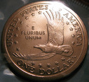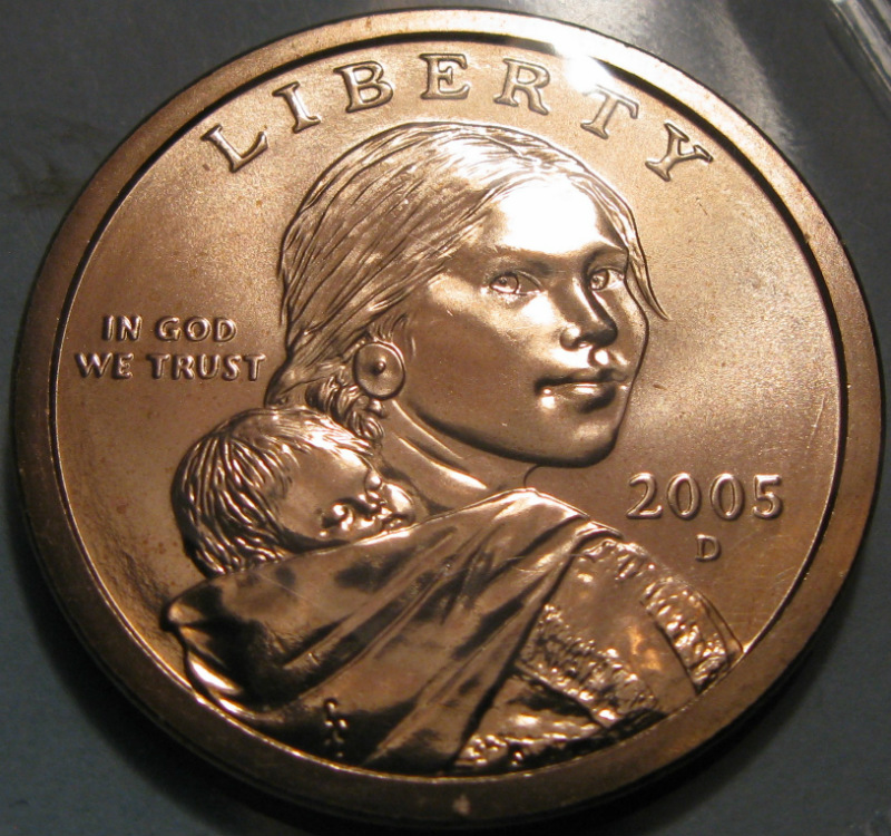 The design of this coin was selected from the 120 entries submitted to a panel appointed by then Treasury Sectary Robert Rubin. They adopted the motif of Sacagawea a young Native American Shoshone as conceived by artist Glenna Goodacre. On her back she carries her infant son, Jean Baptiste. The reverse shows the eagle in flight that was designed by mint engraver Thomas D. Rodgers Sr.
