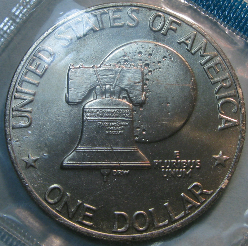 In 1975 the US Mint modified the dies for producing the Eisenhower dollar by changing the reverse to one of national significance by placing the Liberty Bell superimposed on the moon. The date also was changed to a dual date with 1776 - 1976. The coins struck in 1975 were produced with the Variety I design that had low relief with bold lettering on the reverse. The coins of 1976 were produced with the Variety design II that was a sharper design with deleivate lettering on the reverse.