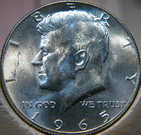 1965 Kennedy half dollar in 40% silver content. These coins will come from bank wrapped rolls and without having the roll present at this time I can only say that they will be a brialliant uncirculated coin, hopefully. I say that because the first Kennedy's struck were poor specimens as a lot of times they used a set of dies too much and the quality of the strike became weaker and weaker on them and the reason I can't be more specific than that. I can say that as they are sold the best coin from the roll will the first sold and so on till they are sold out again. If they become unsightly I will more than likely make a special sale on them and have some pictures to show the poor quality of the coin for your determination as to buy, or not to buy.