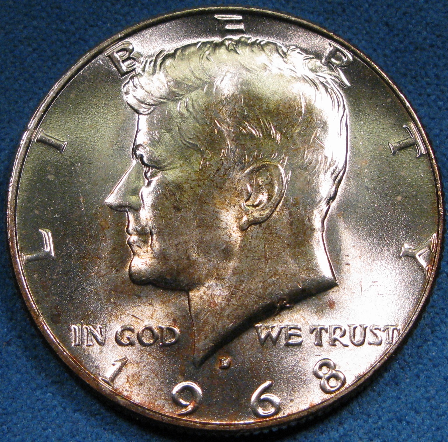 1968D Kennedy half dollar in 40% silver content. Coin will come in the orginal wrapper from the mint, or a paper, vinyl, or mylar, or a 100% archival quality plastic coin edge holder.