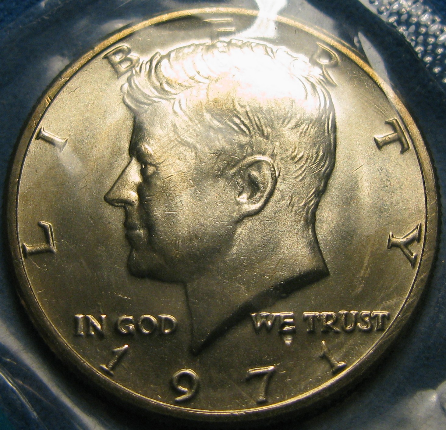 1971 Kennedy half dollar that was the first one in the Kennedy series that was made in nickel clad copper core metal content. Coin will come in the orginal wrapper from the mint, or a paper, vinyl, or mylar, or a 100% archival quality plastic coin edge holder.