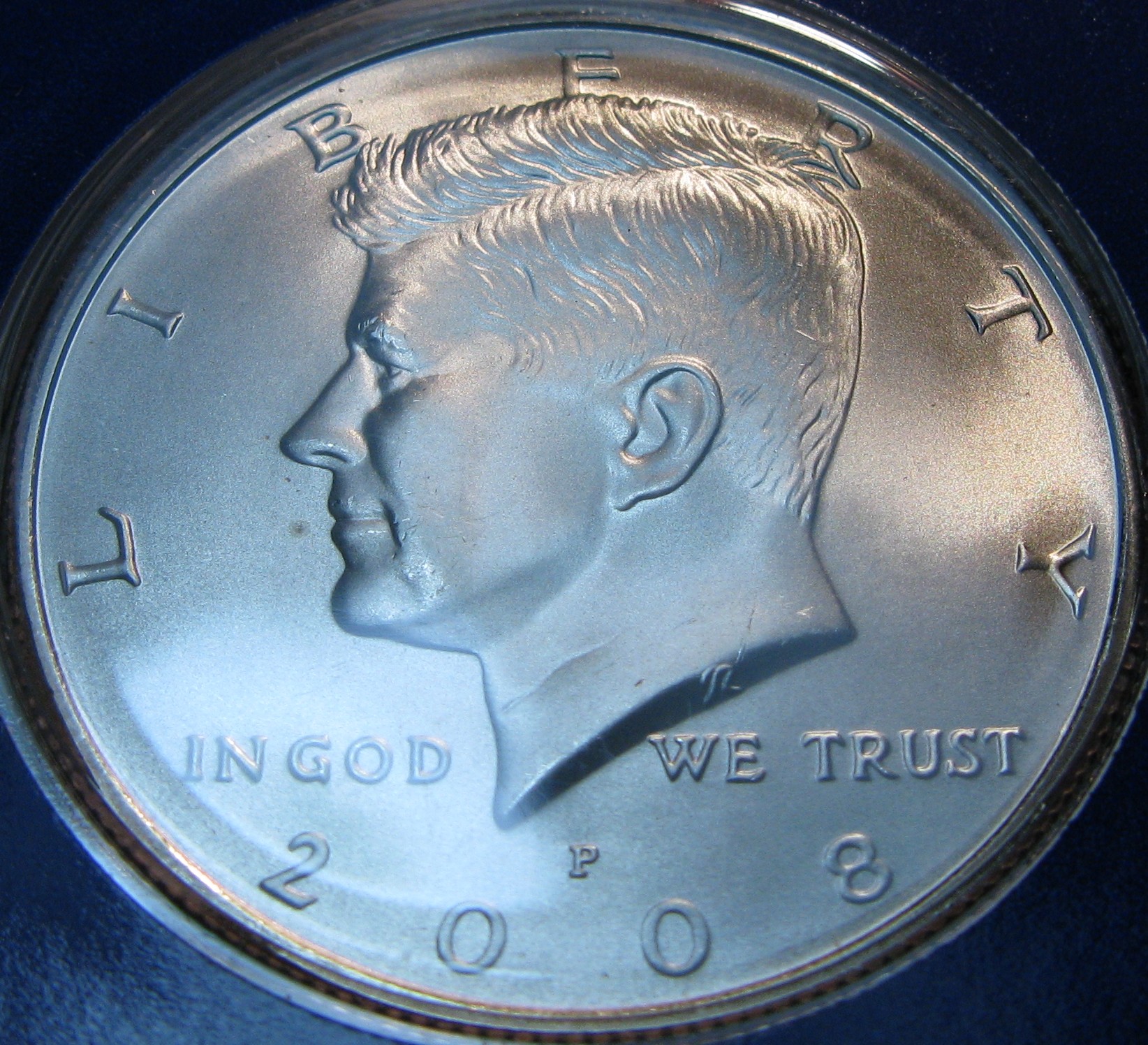 2008P Kennedy half dollar minted in nickel clad copper core metal content. Coin will come in a paper or vinyl flip, or a 100% archival quality plastic coin edge holder.