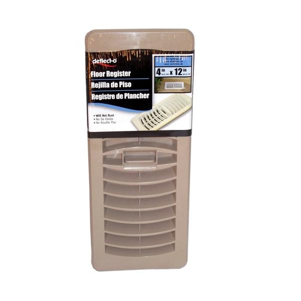 Deflect-O 4" x 12" Taupe Floor Register. Fits openings of 4 inches x 12 inches. Will not rust. Durable plastic material. Clean appearance. Adjusts easily. Case Pack 20