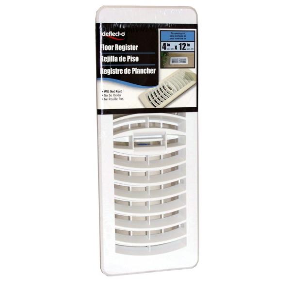 Deflect-O 4 x 12 Inche White Floor Register. Fits openings of 4 inches x 12 inches. Will not rust. Durable plastic material. Clean appearance. Adjusts easily. Case Pack 20