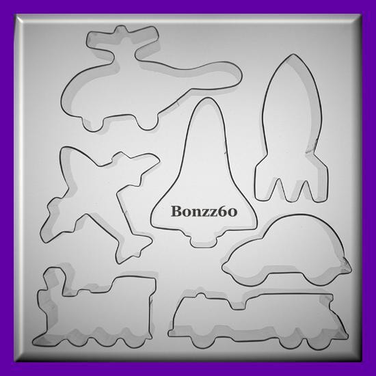 This auction is for a set of 7 tin cookie cutters. These cutters are all made in the USA. Included in this set are one (1) 4" Airplane, one (1) 5" Helicopter, one (1) 4.5" Space Shuttle, one (1) 4" Rocket Ship, one (1) 5" Fire Truck, (1) 3.75" Volkswagon and one (1) 3.5" Locomotive. All sizes are approximate. Please contact us with any questions.
