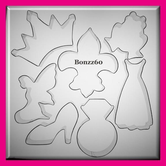 This auction is for a set of 7 all-metal tin cookie cutters. These cookie cutters are all made in the USA. Included in this set are one (1) 5" Crown, one (1) 4.75"Dress, one (1) 4" Shoe, one (1) 3.75" Diamond Ring, one (1) 3" Frog, one (1) 4.5" Fairy, and one (1) 4.5" Fleur de Lis. All sizes are approximate. Please contact me with any questions.