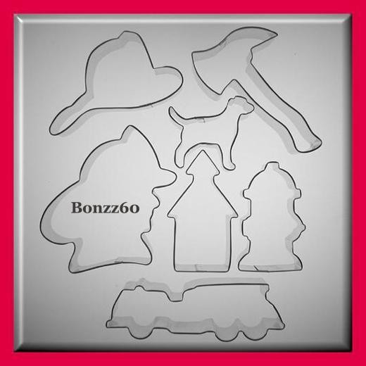 This auction is for a set of 7 all-metal tin cookie cutters. These cookie cutters are all made in the USA. Included in this set are one (1) 4.5" Fireman , one (1) 4" Fireman Axe, one (1) 4" Fireman Hat, one (1) 5" Fire Truck, one (1) 3" Fire Hydrant, (1) 2 5/8" Dalmation and one (1) 3.5" Fire House. All sizes are approximate. Please contact me with any questions.