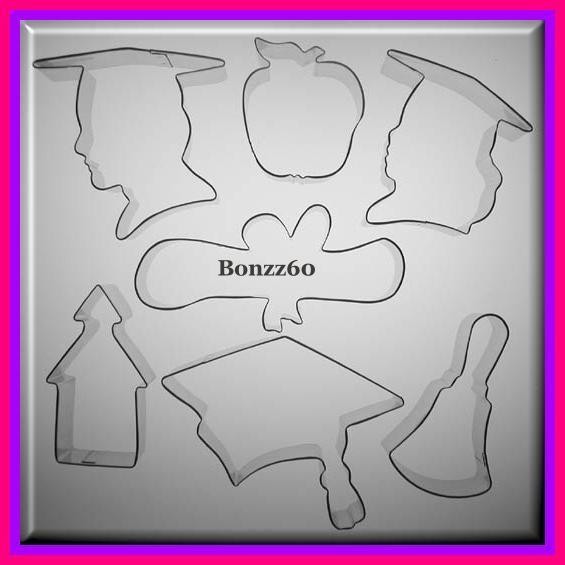 This auction is for a set of 7 all-metal tin cookie cutters. These cookie cutters are all made in the USA. Included in this set are one (1) 4 3/8" Graduation Boy, one (1) 3.75" Graduation Girl, one (1) 5" Diploma, one (1) 3.5" Hand Bell, one (1) 3.5" School House, one (1) 2.5" Apple, and one (1) 5" Graduation Cap . All sizes are approximate. Please contact me with any questions.