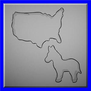This auction is for a two (2) piece set of tin cookie cutters. All my cutters are 1" deep and made in the USA. Included in this set is one (1) 4.5" Map of the USA and one (1) 3.75" Donkey. All sizes are approximate. Please contact me with any questions.