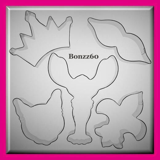 This auction is for a set of 5 tin cookie cutters. These cutters are all made in the USA. Included in this set are one (1) 5" Crown, one (1) 6" Lobster (can be used as crawfish), one (1) 3.5" Cat Face(use as cat face mask), one (1) 5" Mask and one (1) 4.5" Fluer de Lis. All sizes are approximate. Please contact me with any questions.