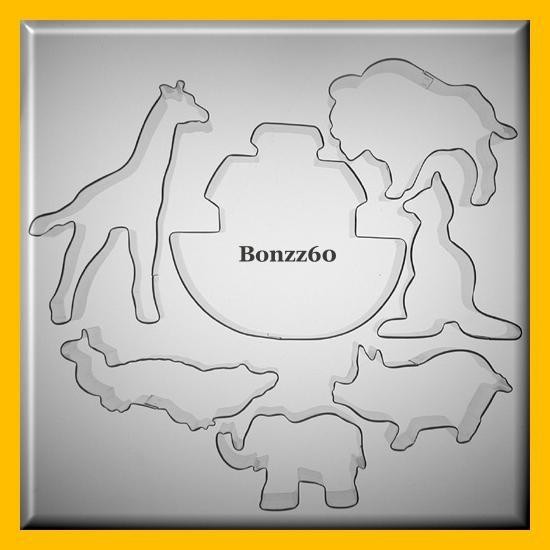 This auction is for a set of 7 all-metal tin cookie cutters. These cookie cutters are all made in the USA. Included in this set are one (1) 5" Noahs Ark, one (1) 4" Kangaroo, one (1) 4" Buffalo, one (1) 4.5" Alligator, one (1) 3" Elephant, one (1) 3" Pig, and one (1) 5" Giraffe. All sizes are approximate. Please contact me with any questions.