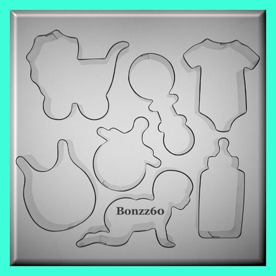 This auction is for a set of 7 cookie cutters. Included in this set are one (1) 4" Baby Bottle, one (1) 4" Baby Rattle, one (1) 4" Baby Carriage, one (1) 3" Pacifier, one (1) 3.25" Bib, one (1)5" Crawling Baby, and one (1)3.5" Onesie. All sizes are approximate.    Please contact me with  any questions.