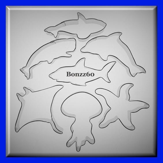 This auction is for a set of 7 all-metal tin cookie cutters. These cookie cutters are all made in the USA. Included in this set are one (1) 4" Jellyfish, one (1) 3.75" Starfish, one (1) 4" Manta Ray, one (1) 4" Jumping Whale, one (1) 4" Killer Whale, one (1) 4" Shark and one (1) 4.5" Dolphin. All sizes are approximate. Please contact me with any questions.