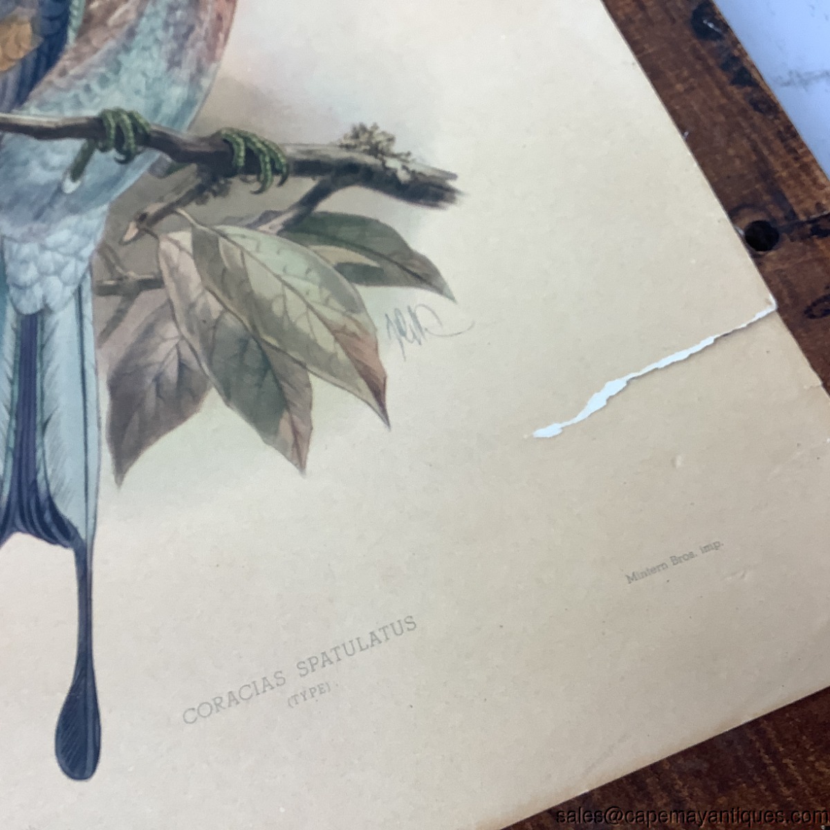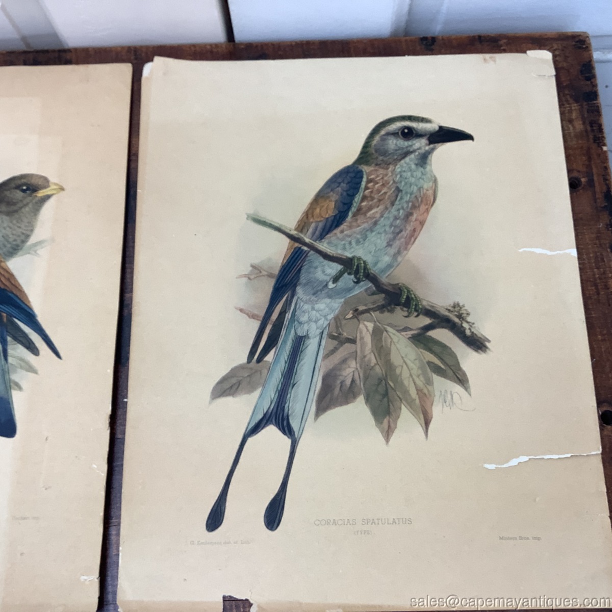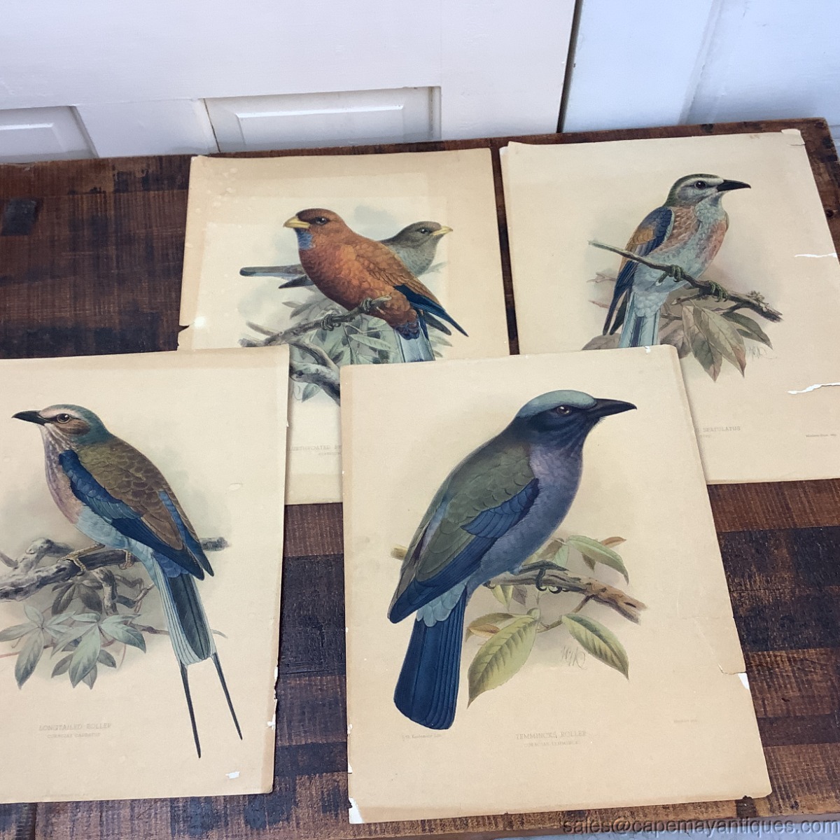 Set of 4 old, antique Lithographs made in the USA, published by Morris & Bendien Inc. Original artist is J.G. Keulemans, a Dutch artist. The birds include Temmincks Roller, Longtailed Roller, Bluethroated Bradbelled Roller and Coracias Spatulatus. These measure 14" by 11". As shown condition with aging in color and rips and tears on side matting areas as well. These could be framed and so beautiful! Johannes Geradus Keulemans.