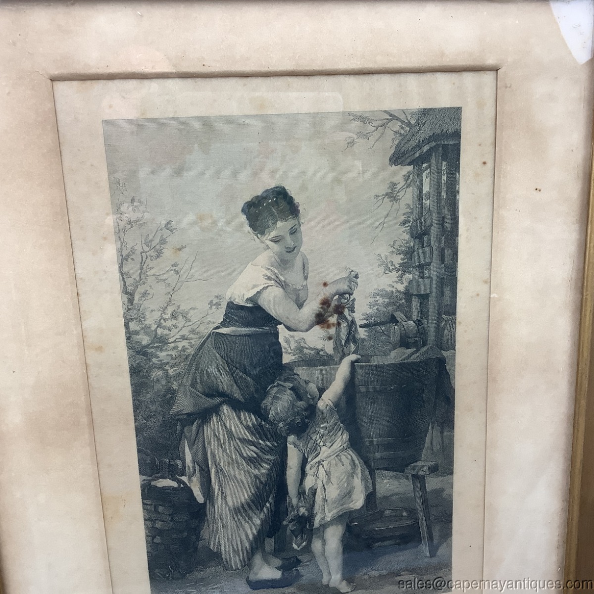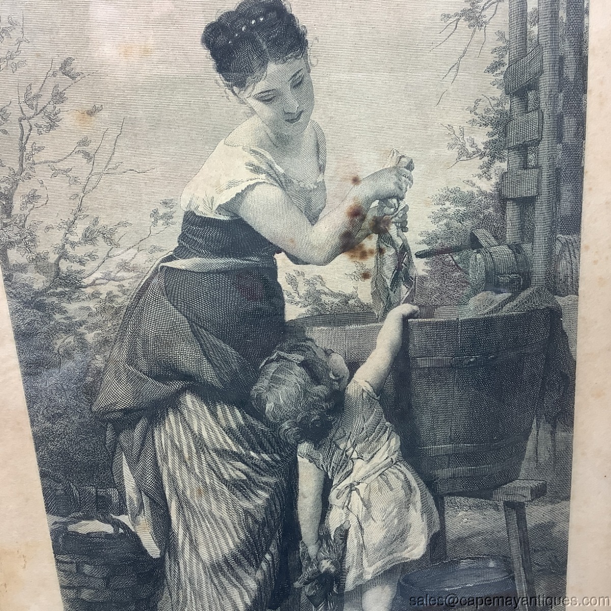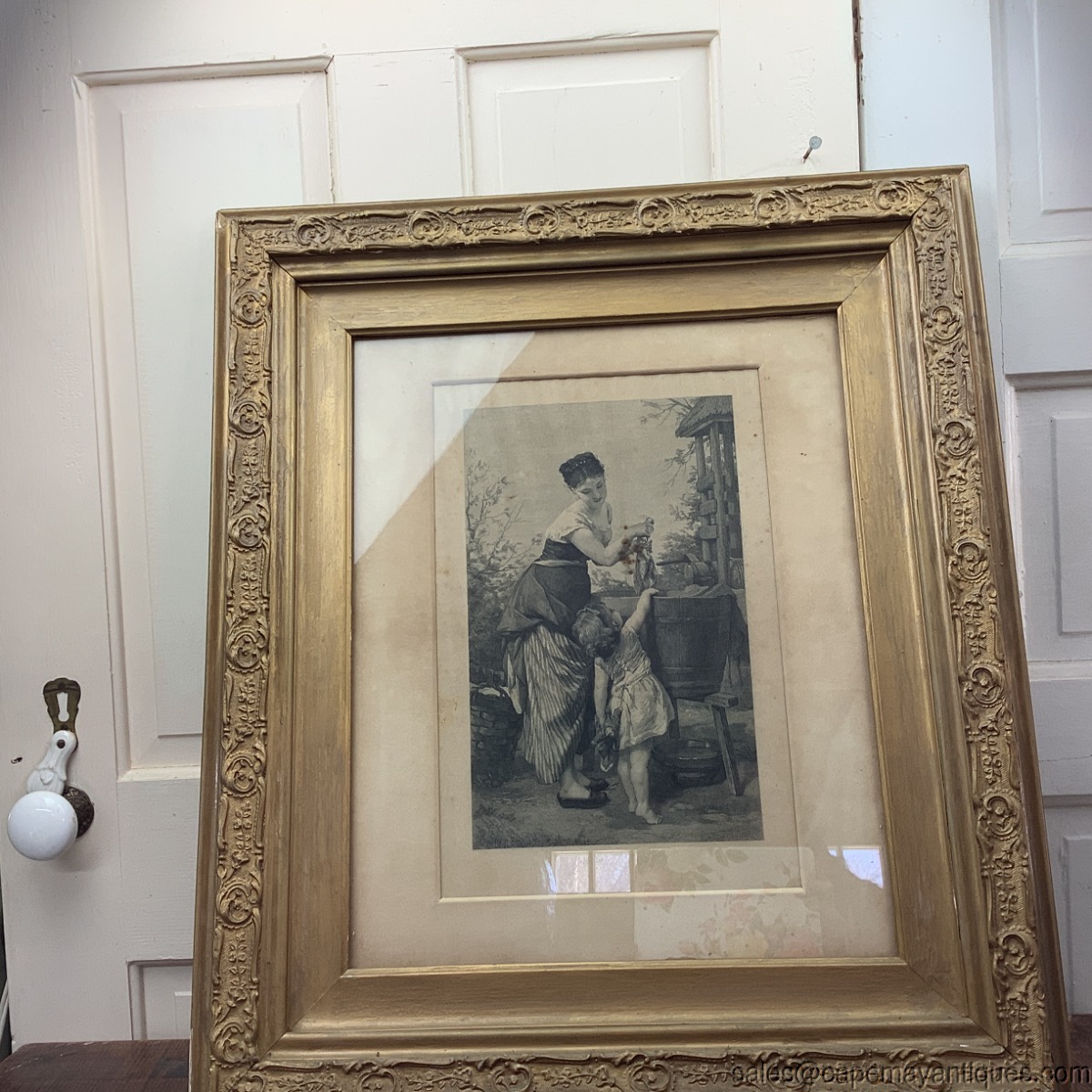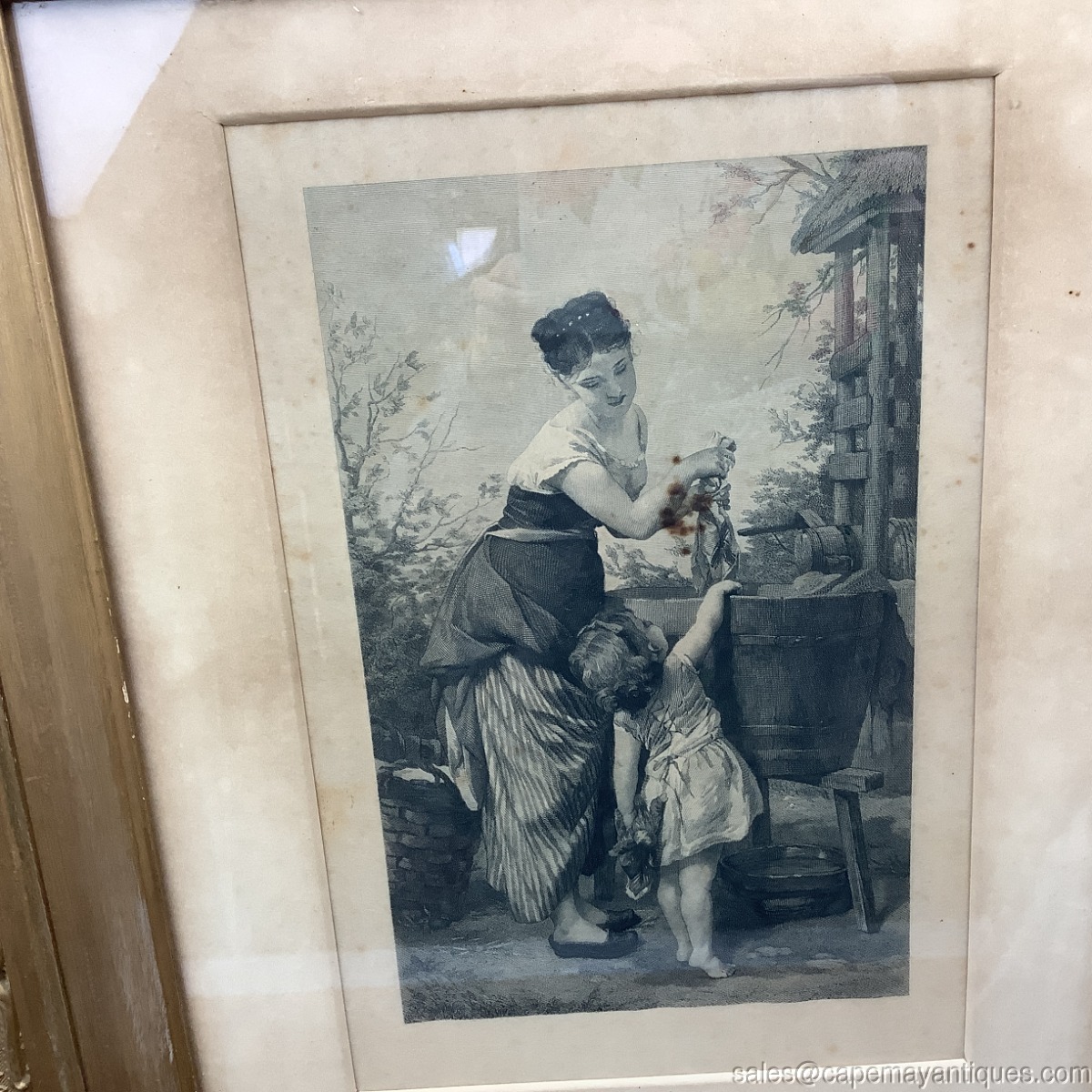 Wonderful antique French print framed and matted and title on back is Little Curious by French artist Lobrichon. Features a young mother washing clothes in an old style barrel near a well while the little girl is standing on tippy toes reaching into the barrel of water with one hand while holding her dolly with the other hand. Mother looks on at her lovingly. Remnants of the back paper label state it is an "unlettered proof" Painted by Lobrichon, Engraving by Alphonse Lamotte. Published by The A. B. Benesch Co NY. The carved wood frame that appears to have been recently painted showing some different shades of gold measures 28.5" by 24.5". The print is 16" by 10.5". The matting is darkened paper from age, the print itself shows darkening from age as well. There are large brown spots on the mothers arm section. There are no rips or tears. She's just really old, probably turn of the century.