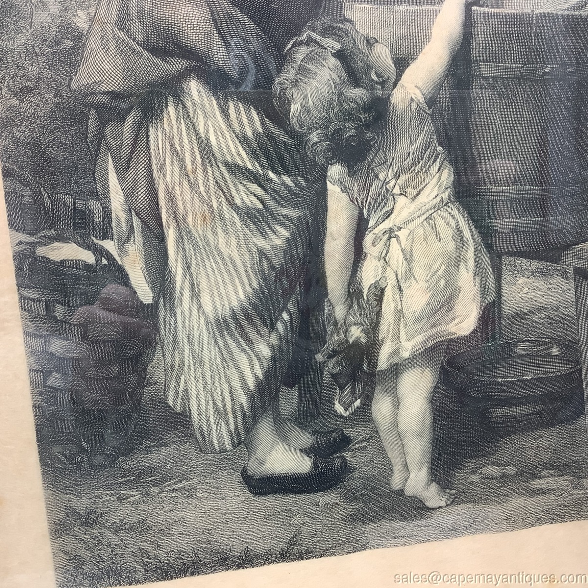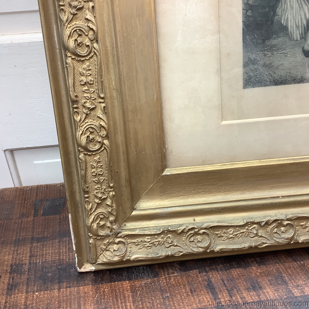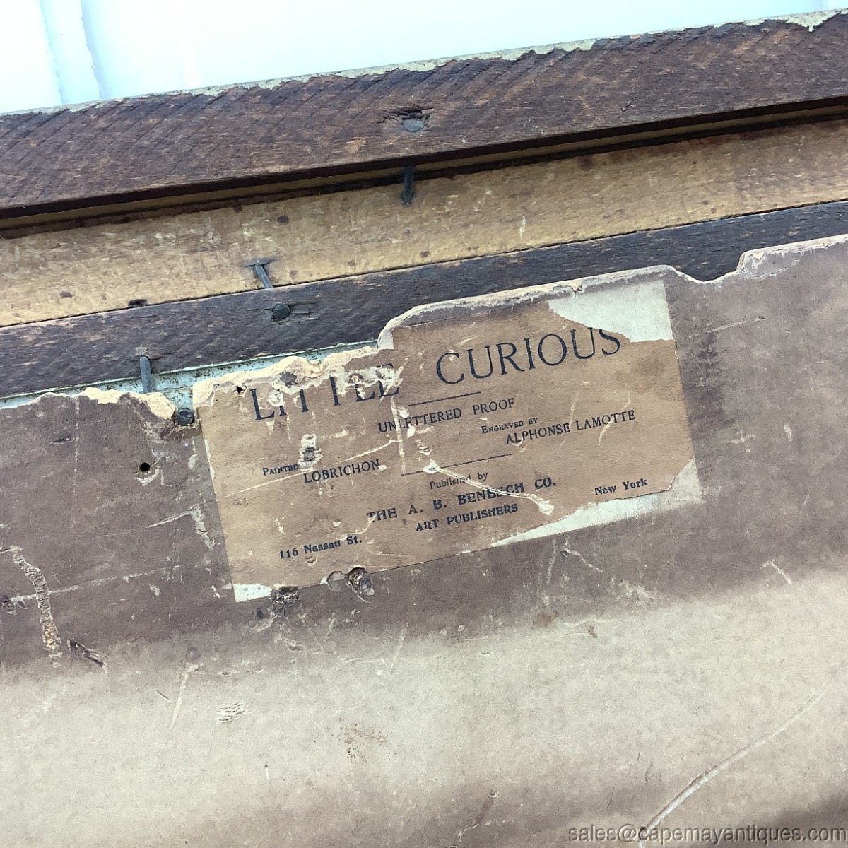 Wonderful antique French print framed and matted and title on back is Little Curious by French artist Lobrichon. Features a young mother washing clothes in an old style barrel near a well while the little girl is standing on tippy toes reaching into the barrel of water with one hand while holding her dolly with the other hand. Mother looks on at her lovingly. Remnants of the back paper label state it is an "unlettered proof" Painted by Lobrichon, Engraving by Alphonse Lamotte. Published by The A. B. Benesch Co NY. The carved wood frame that appears to have been recently painted showing some different shades of gold measures 28.5" by 24.5". The print is 16" by 10.5". The matting is darkened paper from age, the print itself shows darkening from age as well. There are large brown spots on the mothers arm section. There are no rips or tears. She's just really old, probably turn of the century.
