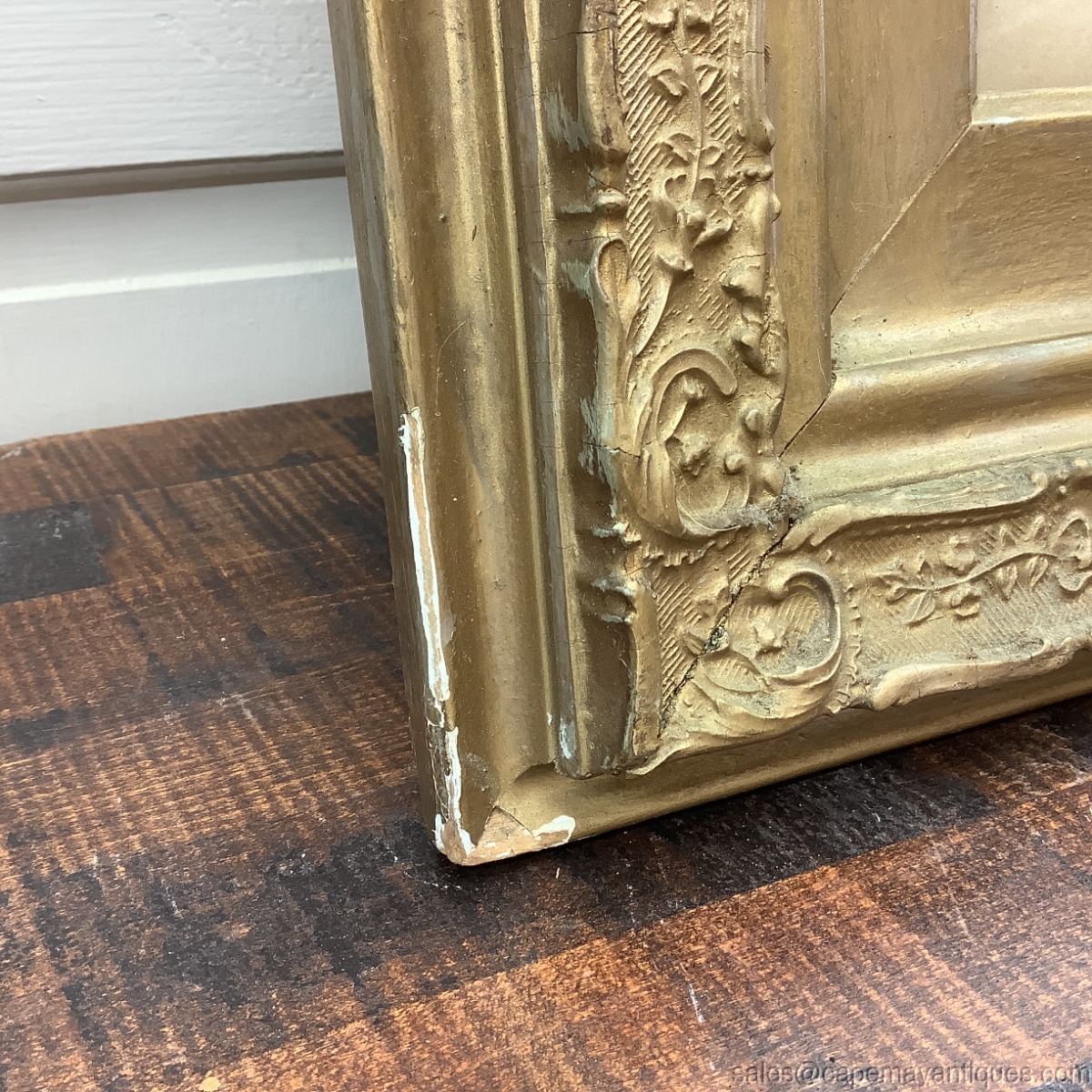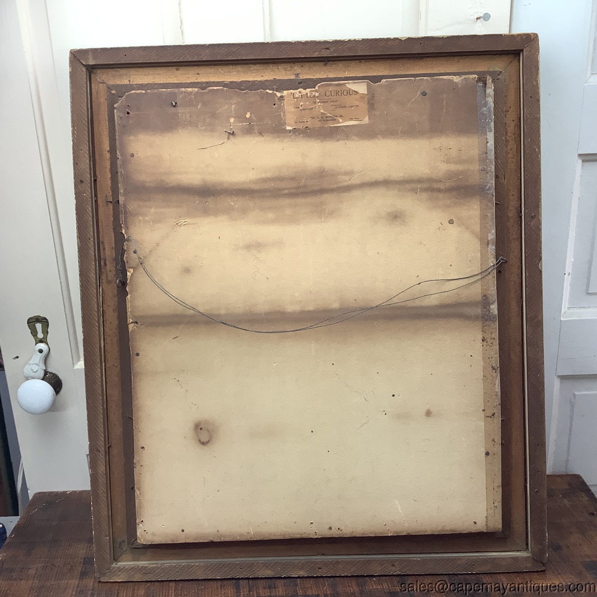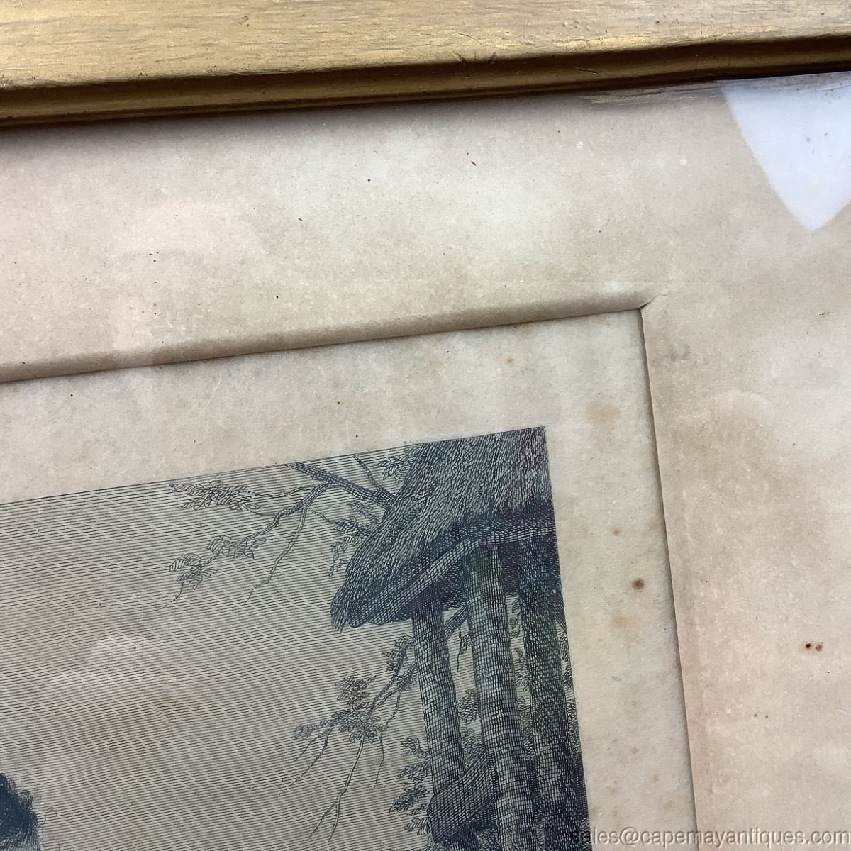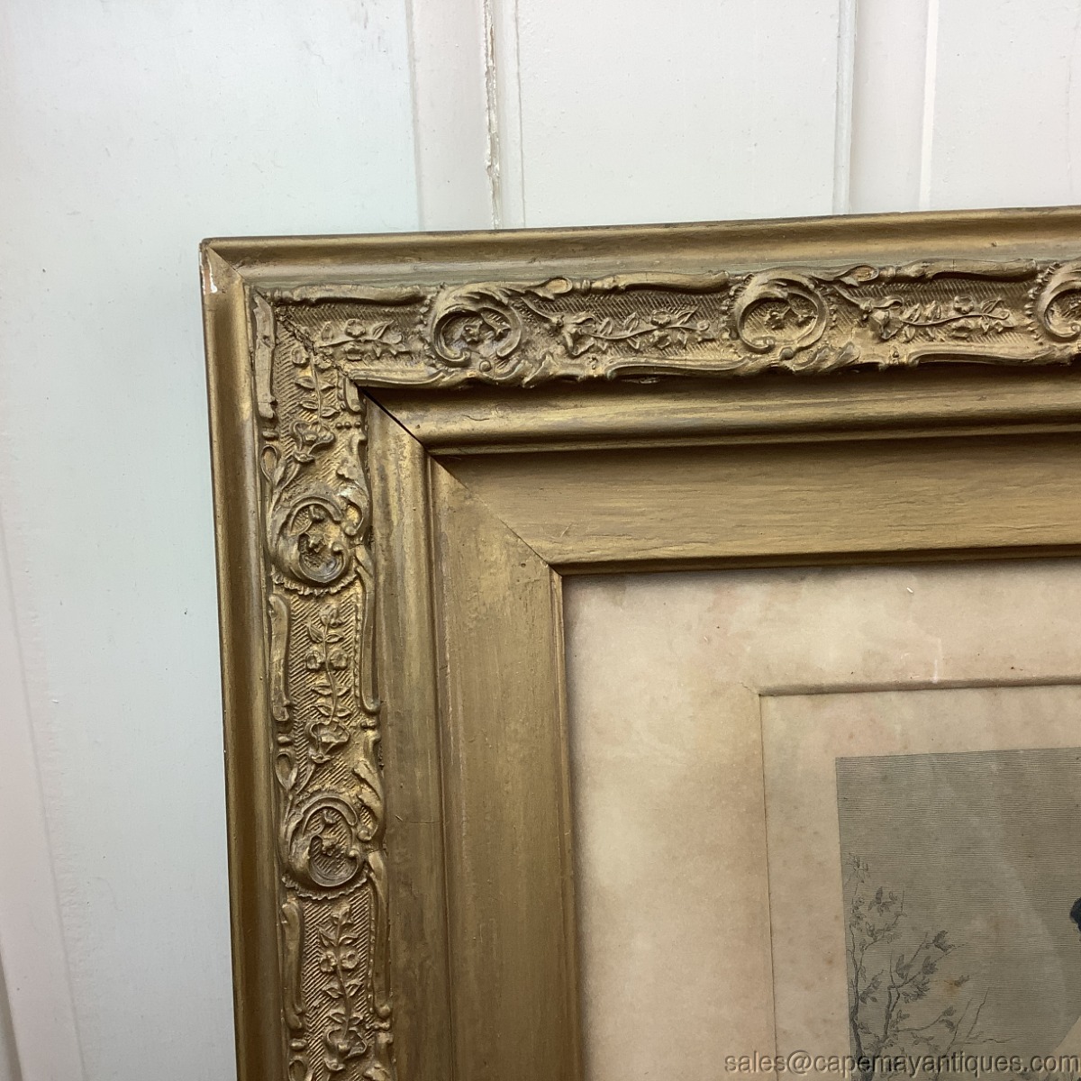 Wonderful antique French print framed and matted and title on back is Little Curious by French artist Lobrichon. Features a young mother washing clothes in an old style barrel near a well while the little girl is standing on tippy toes reaching into the barrel of water with one hand while holding her dolly with the other hand. Mother looks on at her lovingly. Remnants of the back paper label state it is an "unlettered proof" Painted by Lobrichon, Engraving by Alphonse Lamotte. Published by The A. B. Benesch Co NY. The carved wood frame that appears to have been recently painted showing some different shades of gold measures 28.5" by 24.5". The print is 16" by 10.5". The matting is darkened paper from age, the print itself shows darkening from age as well. There are large brown spots on the mothers arm section. There are no rips or tears. She's just really old, probably turn of the century.