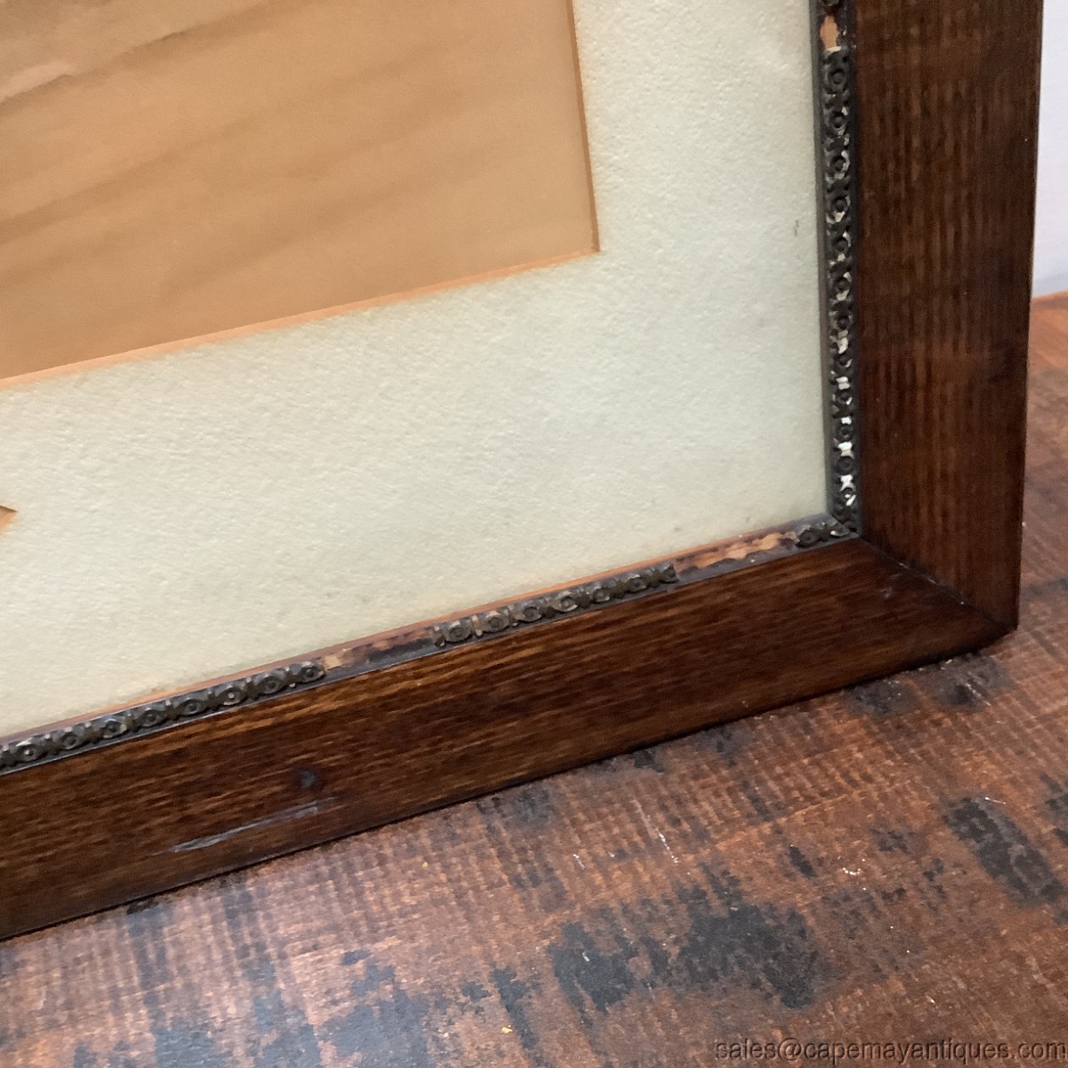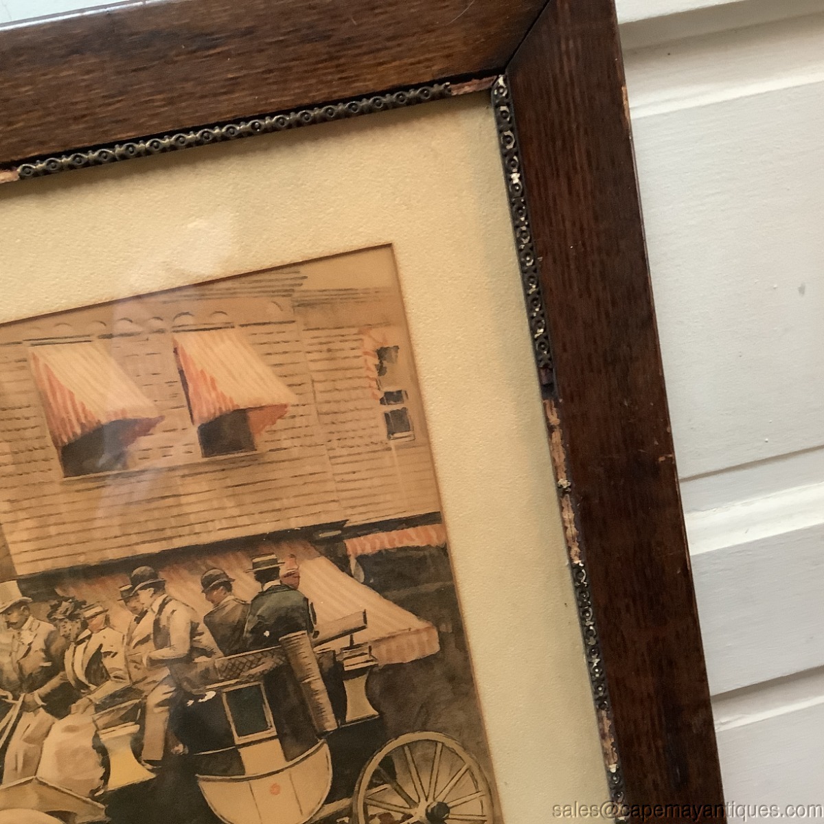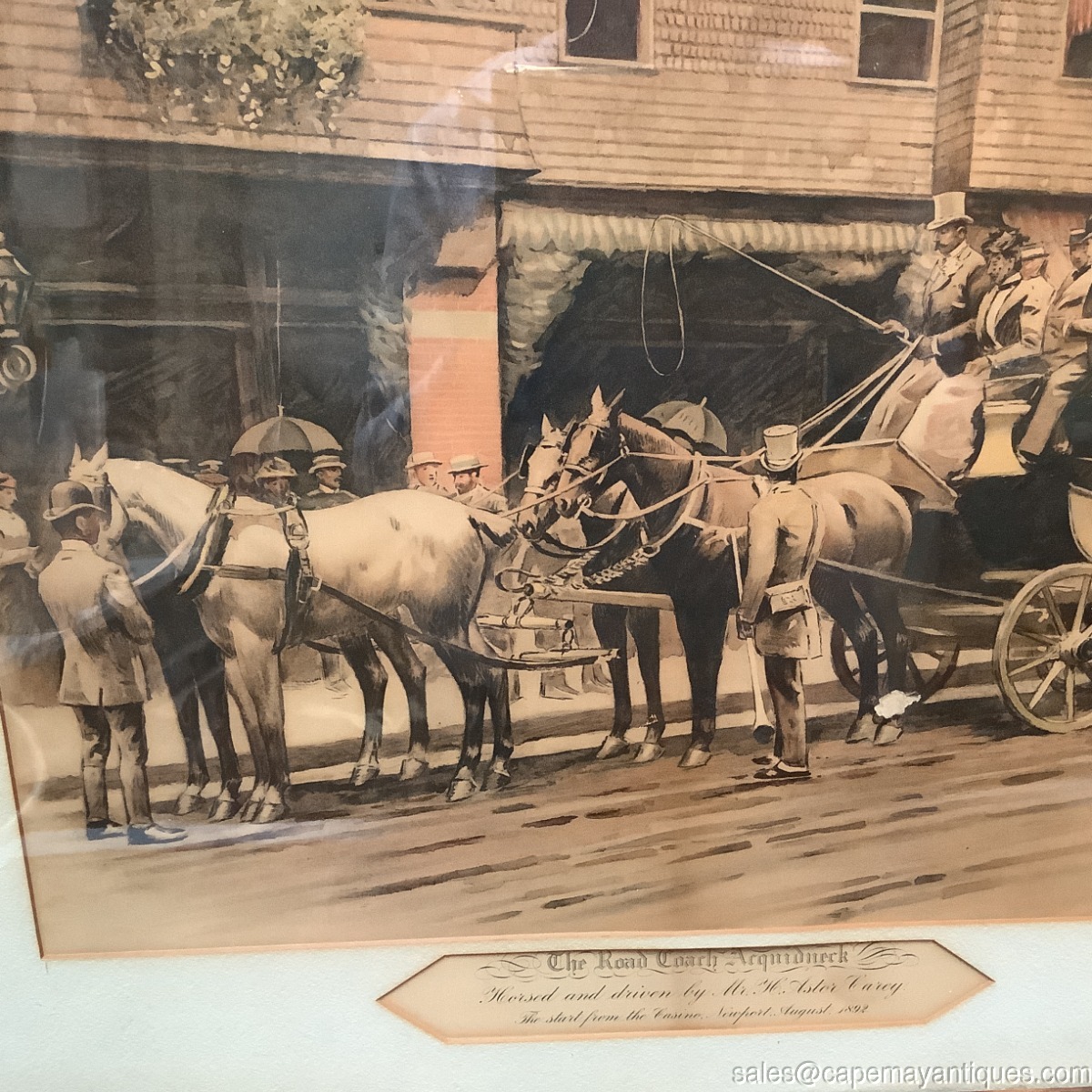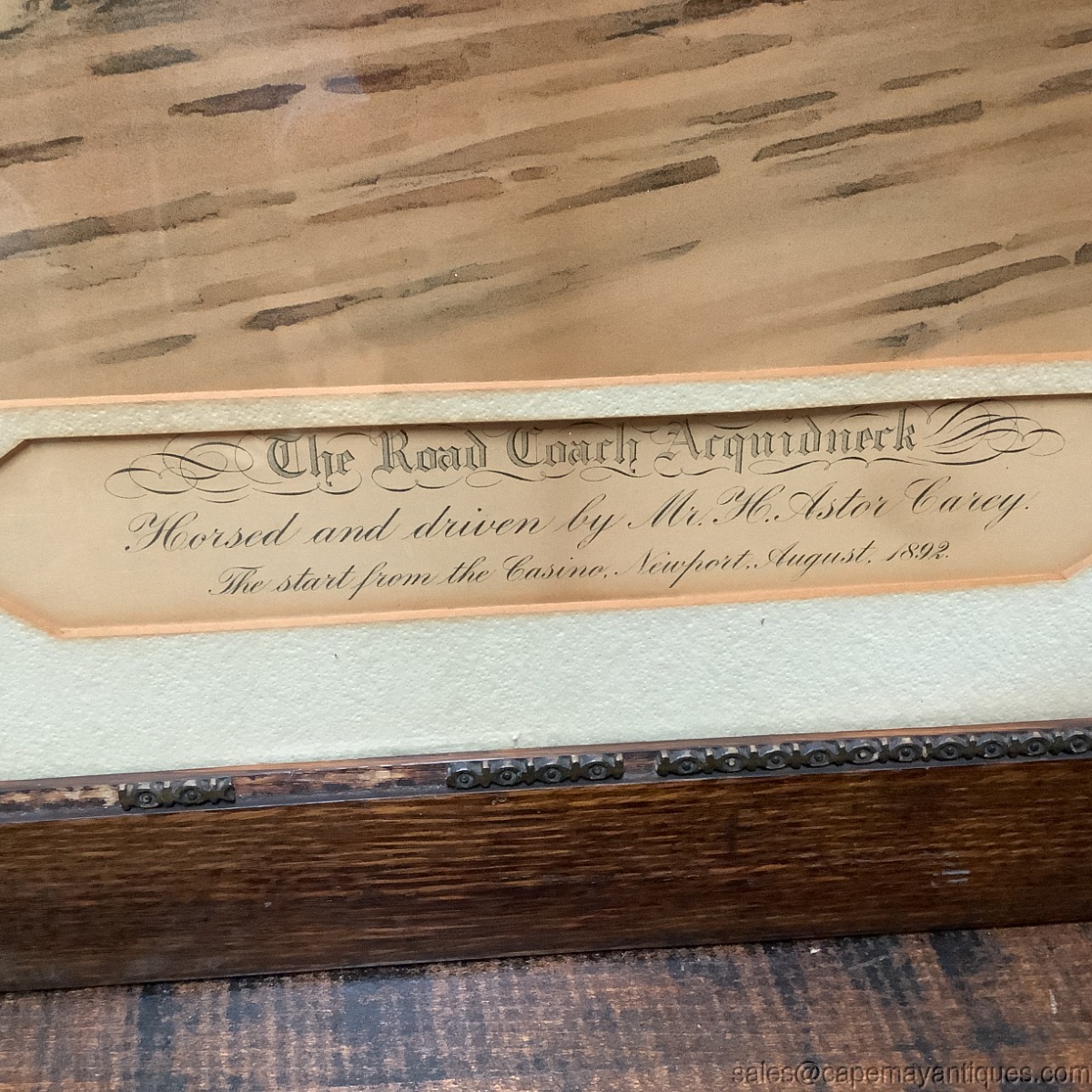 Wonderful antique framed print under original glass entitled The Road Coach Acquidneck. Horsed and driven by Mr. H Astor Carey. The start from the Casino, Newport August 1892. Oak wood frame measures 27" by 23" tall, the print is 19.25" by 14.25". Good condition overall but interior ceramic beading on the frame is very brittle, broken off in most sections and continues to break off when handle. Some minor scratches on the frame. Natural aged coloring on the matting and print.