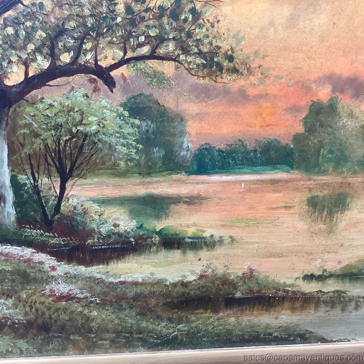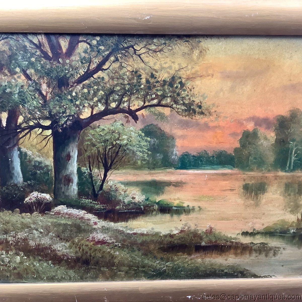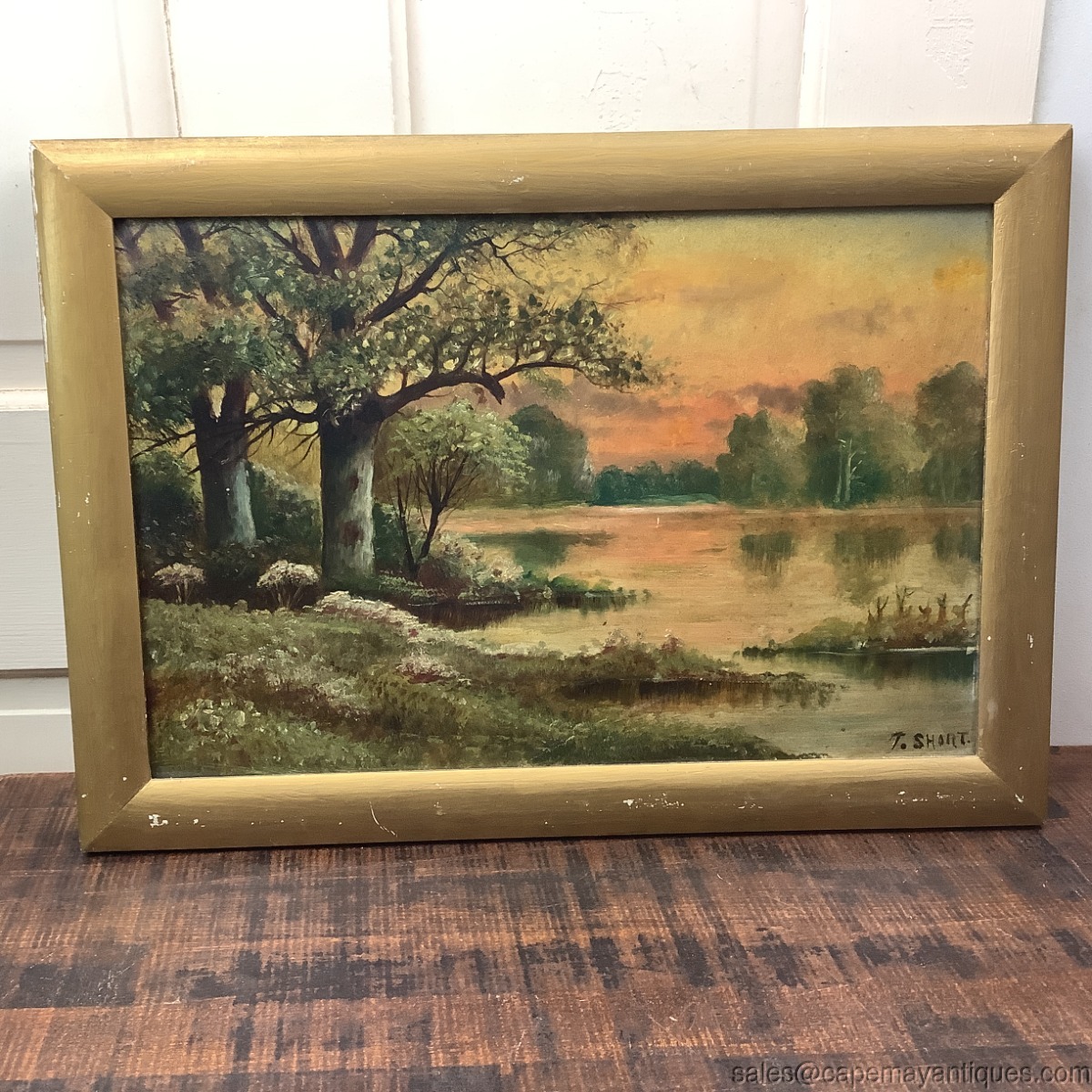 Nice old oil painting on artist board with original antique label on the back. The painting features a rising or setting sun colored sky with orange to pink shades in the sky. The foreground features marsh, wetland area with blooming large trees and jagged shoreline with wild flowers. Signed T. Short, bottom right hand corner. The gold frame measures 20.5" length by 14.5" tall. The artist board is 18" by 12". The frame has some discoloration and chips to the gold finish. the board is in good condition with no holes and major marks, some light marks in the foreground, please see all photos.