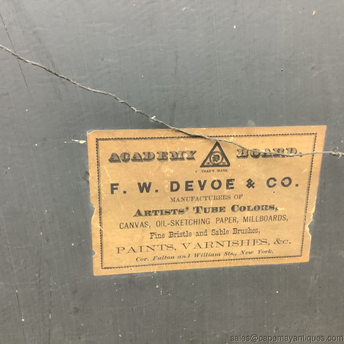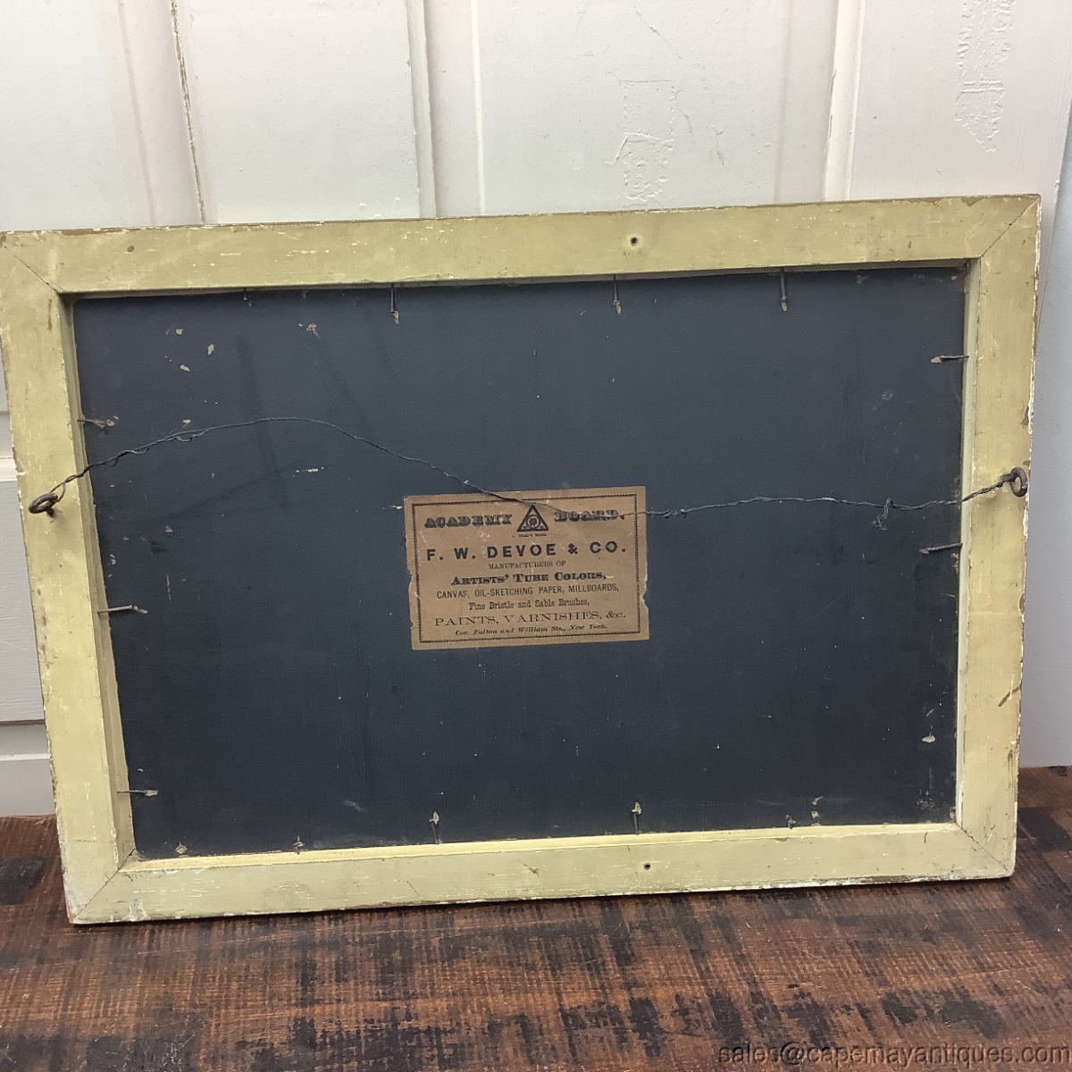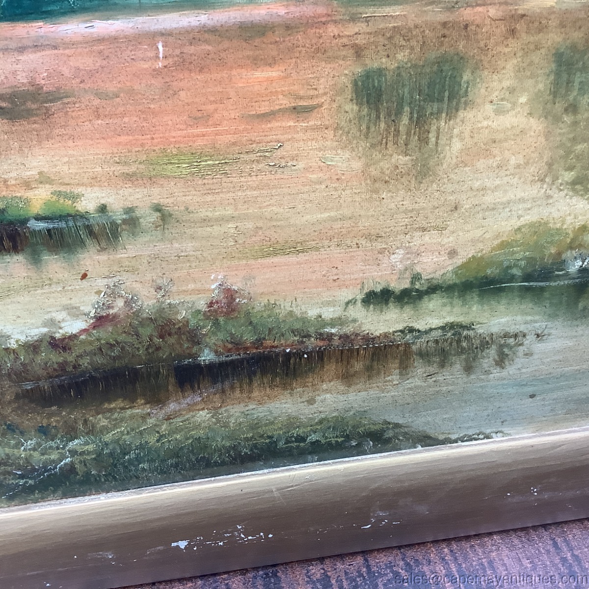 Nice old oil painting on artist board with original antique label on the back. The painting features a rising or setting sun colored sky with orange to pink shades in the sky. The foreground features marsh, wetland area with blooming large trees and jagged shoreline with wild flowers. Signed T. Short, bottom right hand corner. The gold frame measures 20.5" length by 14.5" tall. The artist board is 18" by 12". The frame has some discoloration and chips to the gold finish. the board is in good condition with no holes and major marks, some light marks in the foreground, please see all photos.