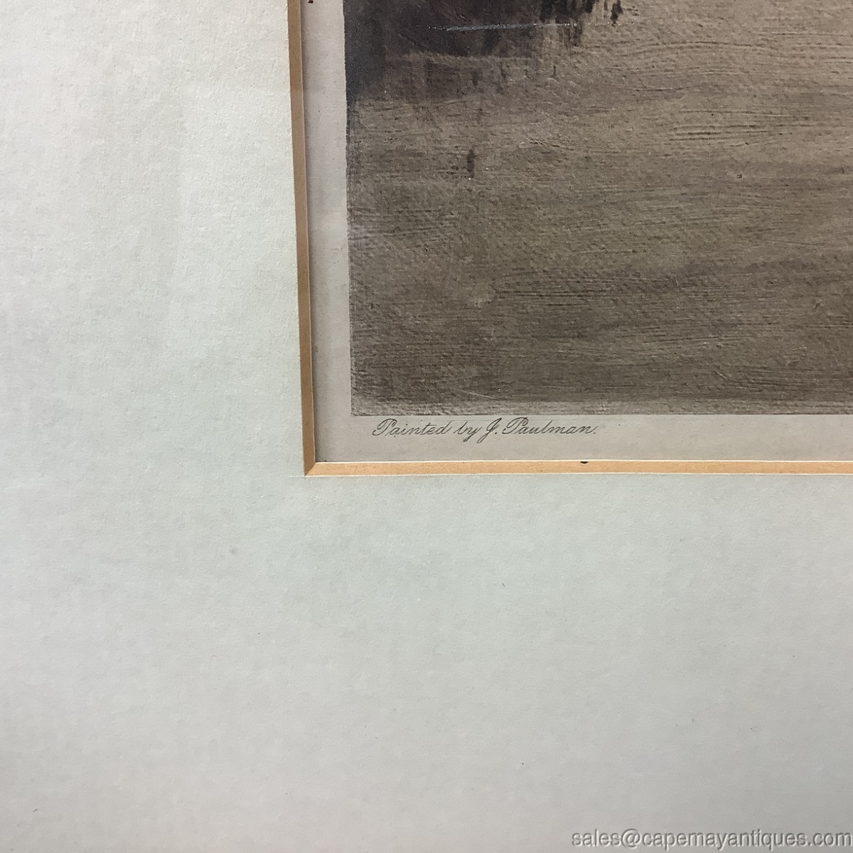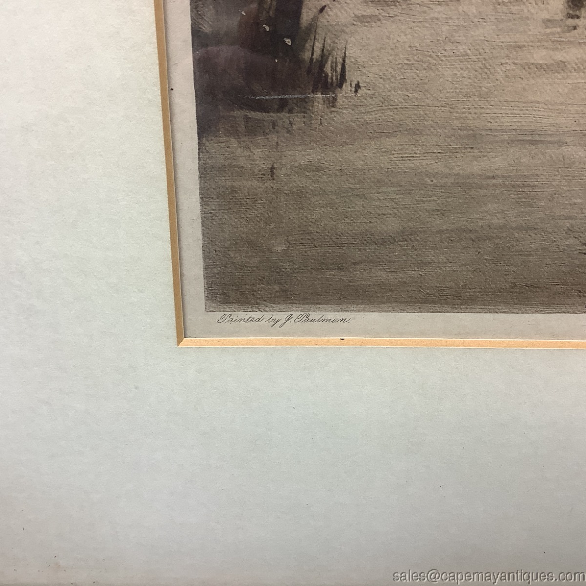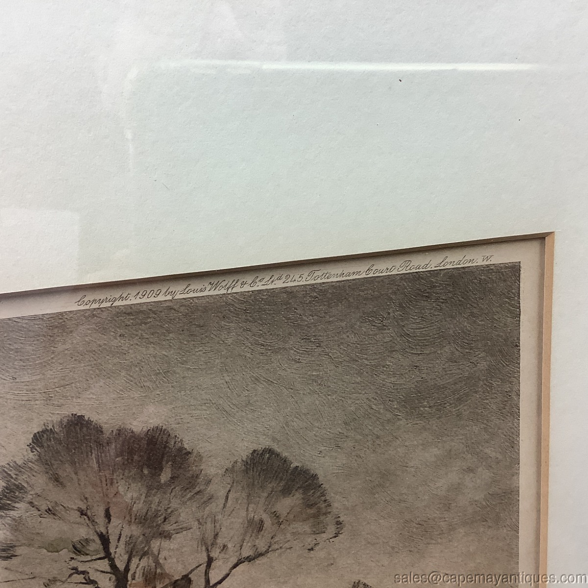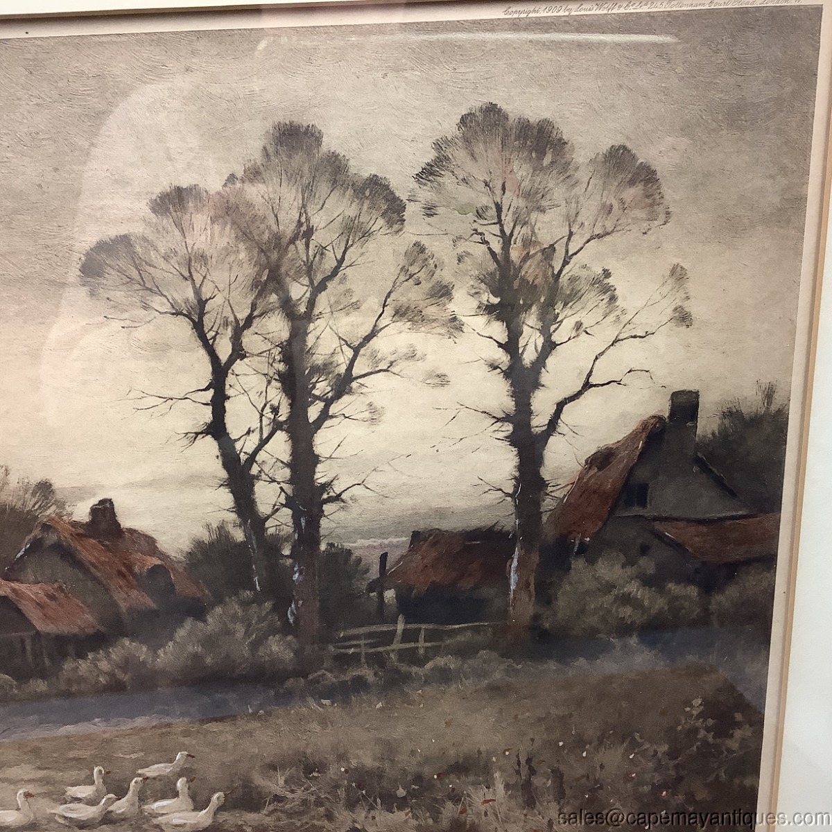 Wonderful antique print featuring a British European farm scene including female with basket, walking stick and plethora of white ducks walking ahead of her on the path. The background features thatched roof cottages, split rail fence and other structures cottages and barns. Top left corner is marked Printed in England, bottom left hand corner states Painted by J. Paulman and upper right hand corner states Copyright 1909 by Louis Wolff & Co London with their street address. The print may be hand colored or mechanically colorized. The frame is gold tone wood with some carvings on the exterior edge. The frame measures 22.5" tall by 28.5" wide and the print is 13" by 19" length. Good condition overall with frame showing some white marks, missing trim work and gold tone variations. The print is in good condition, protected under glass with slight discoloration from age. Gorgeous antique print perfect for a country home or English decor.