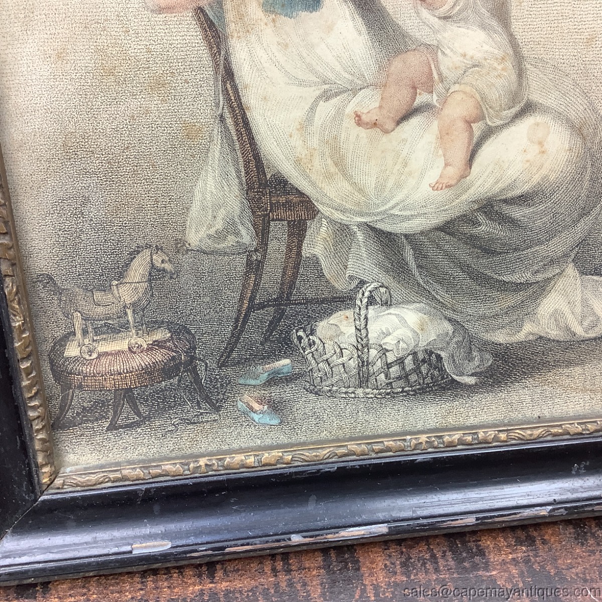 Antique print that I believe is by German artist Eugen Klimsch and title is Mother and Child or Children. Very old, colored lithograph depicting Mother with playful child on her lap. Seated in nursing chair with baby in lap, bonnet, basket by her feet and a stool holding a rocking horse. The wood frame is old and original. Measures 9.5" by 10.5". The artwork is 7.5" by 9". There is discoloration to the paper, lots of yellowing in the background, frame has lots of wear to black trim as well as 2 holes on sides where it was attached to wall. Such history and unique wear. Lovely print.