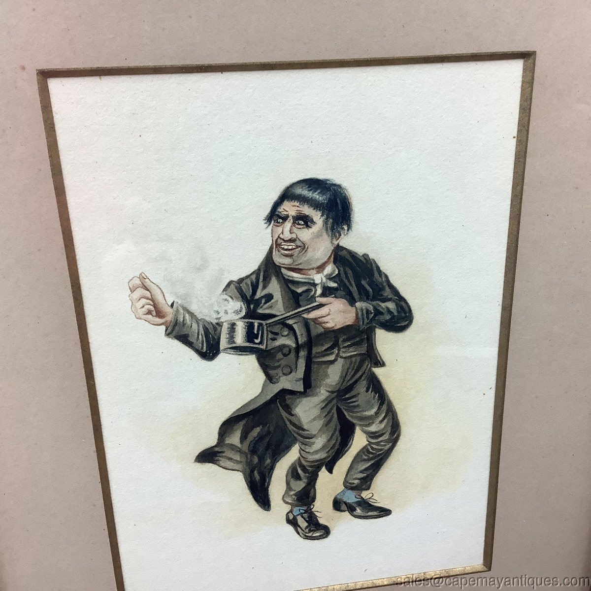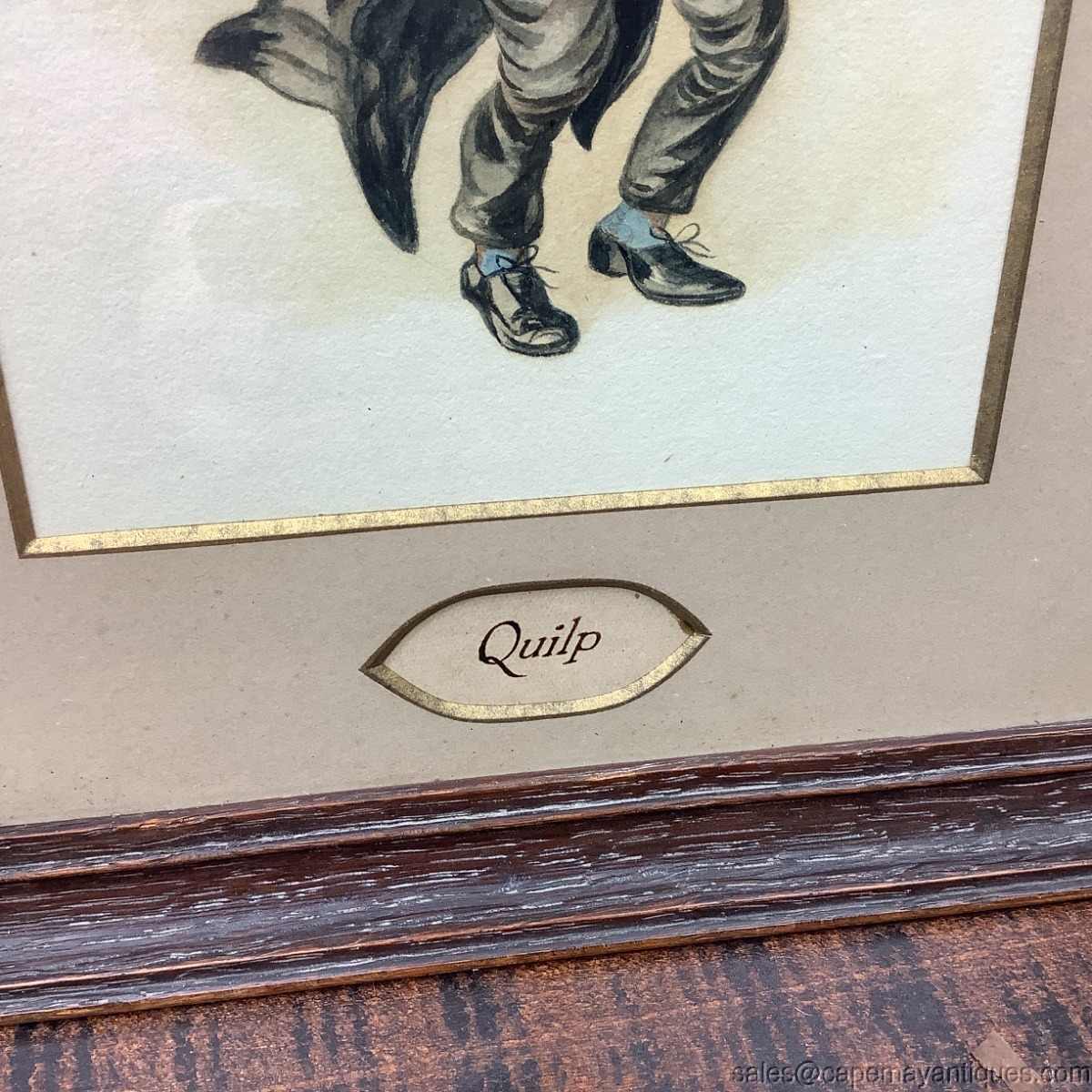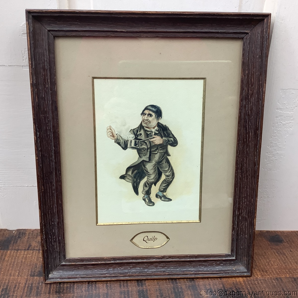 Quite old and in good condition. Most likely original frame, matting and glass. This depiction of Quilp varies slightly from others I researched by Joseph Clayton Clarke as the background is light in color where other show a darkened cloud behind him. The frame measures 11.5" by 9.5". The visible print is 4.75" by 6.5". Not sure what type of print this represents ie. litho or engraving. Could even be hand colored. Lovely gold accents surrounding his name and the inner print. Here Quilp is enjoying boiling tea with out showing any discomfort, as referenced with steaming pot in his hand. Good condition for it's age with print well protected under glass. The frame has some minor wear on edges.