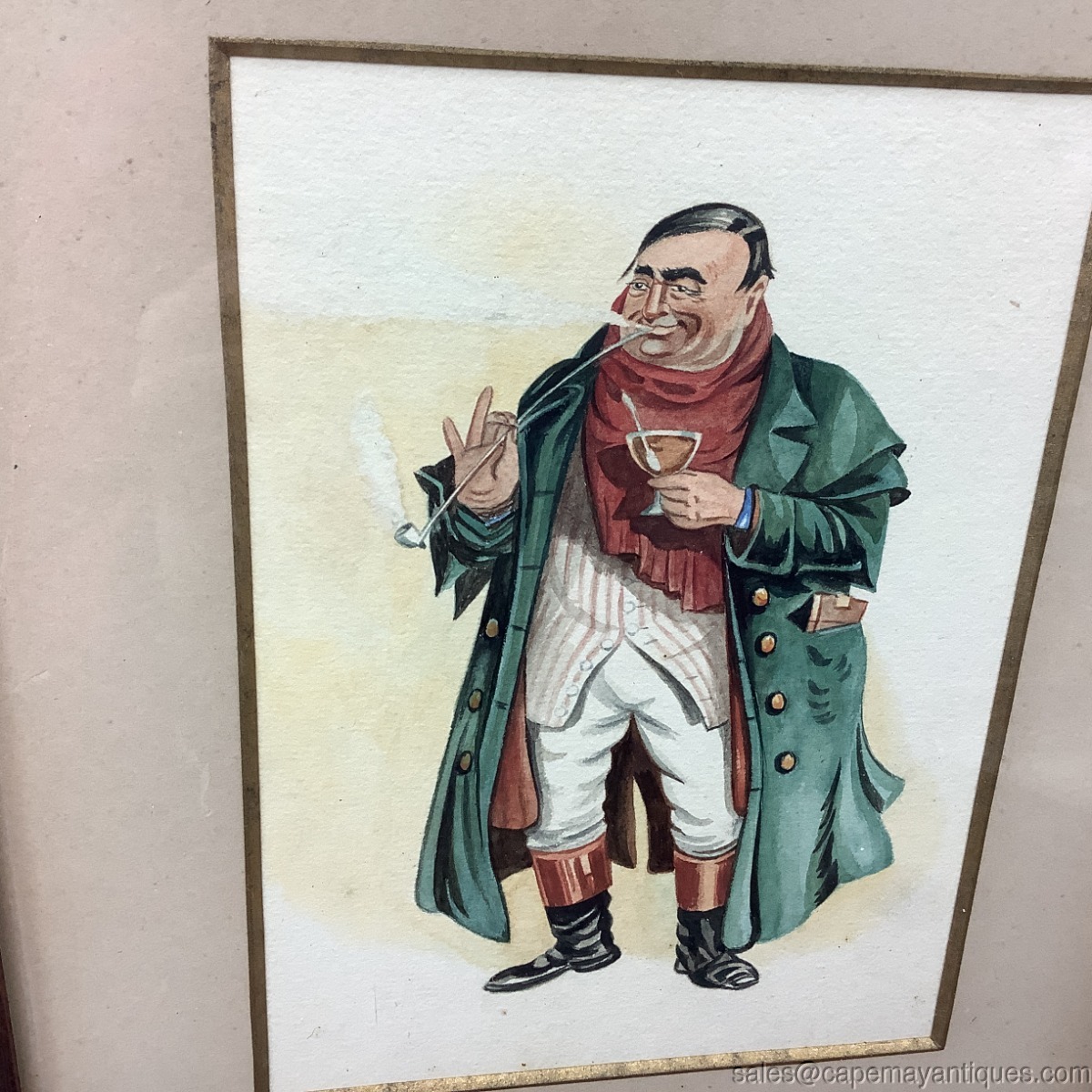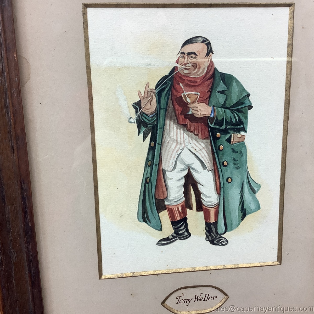 Lovely, old antique framed print titled Tony Weller. The framed print under glass features Tony Weller from Charles Dickens first novel, The Pickwick Papers. The original wood frame measures 11.5" by 9.5". The print is 4.75" by 6.5". The inner trim of the matting is gold with same trim around the title of the print. I believe this might be hand tinted. No small dots when loop is used to examine same. Good condition overall, with a spot on matting left upper section near the wood frame, minor discoloration in the background of the print above the flume of smoke coming from his pipe. Artist is Joseph Clayton Clarke. Humorous caricature perfect for decorating a home office, library or writers den.