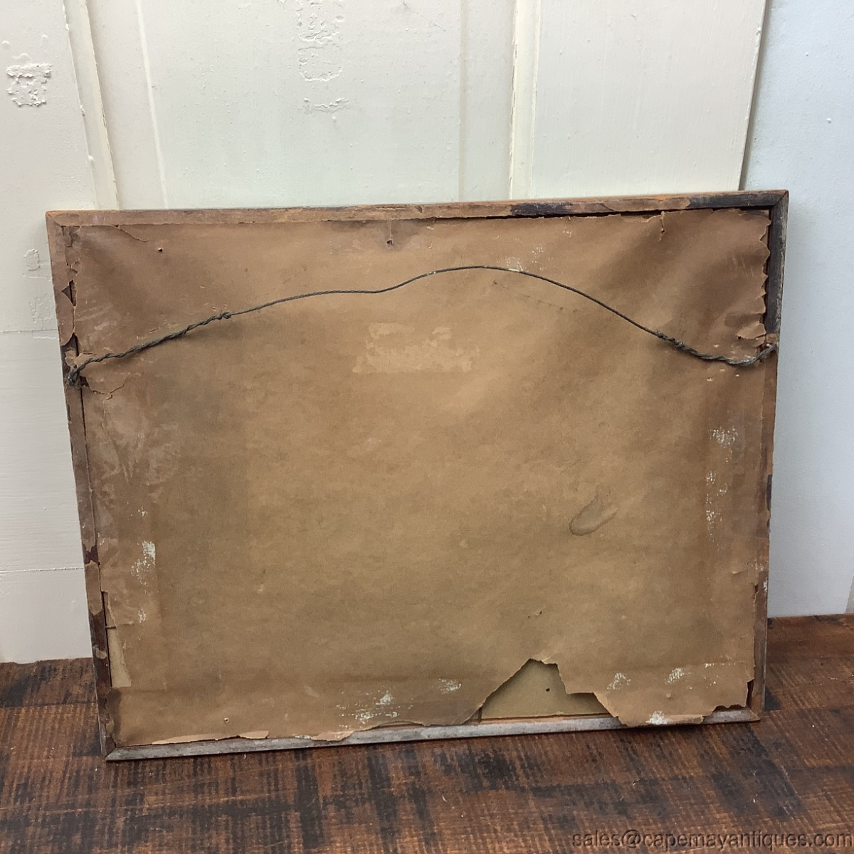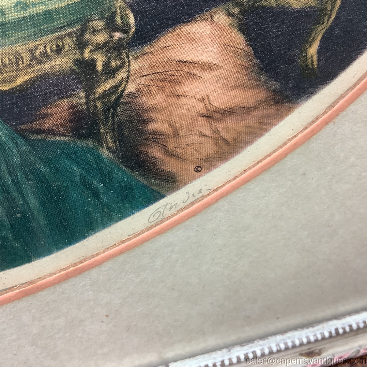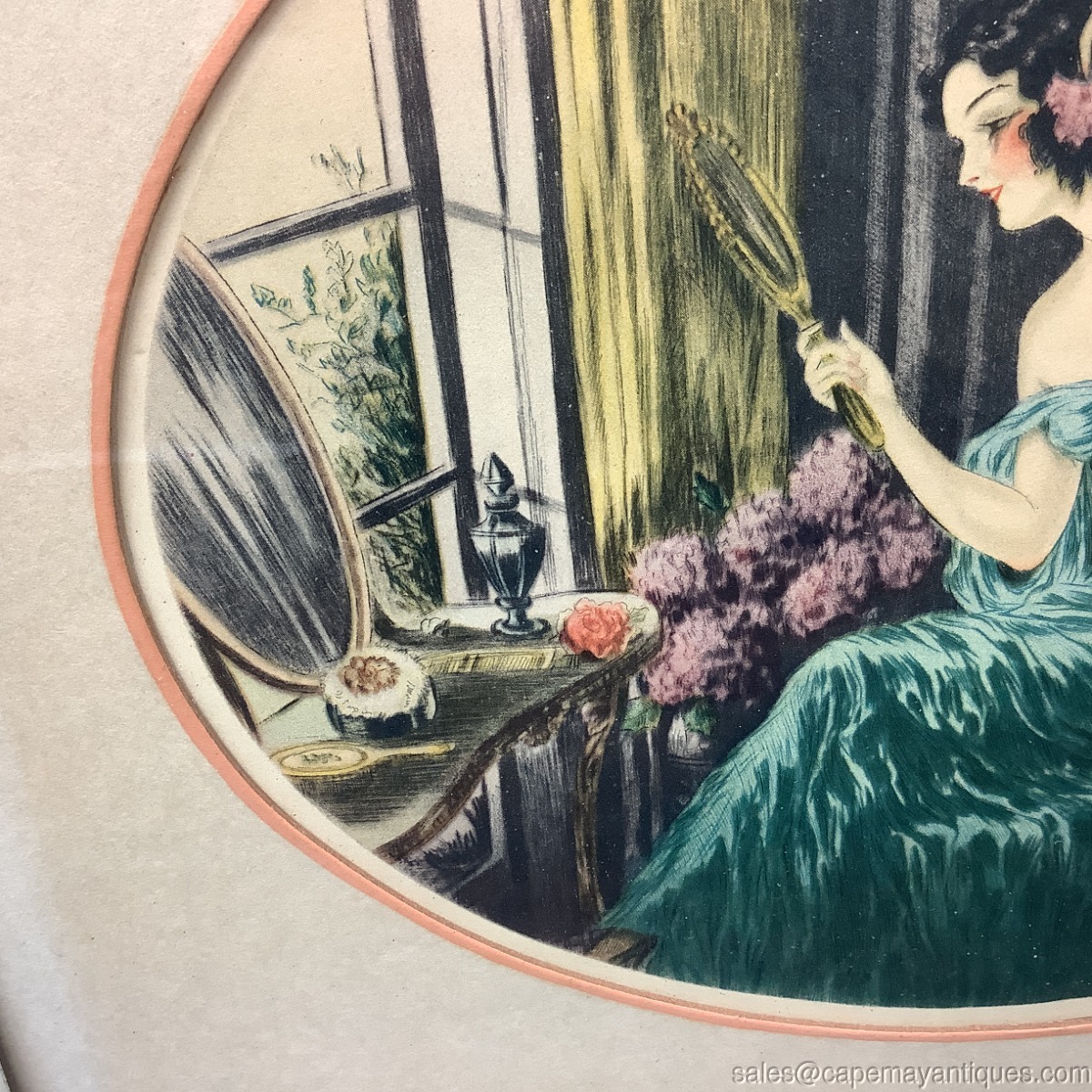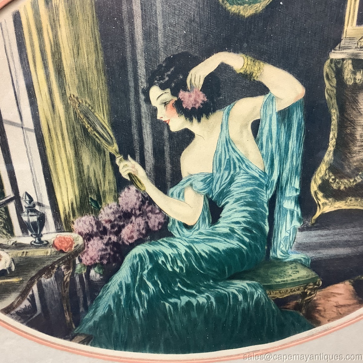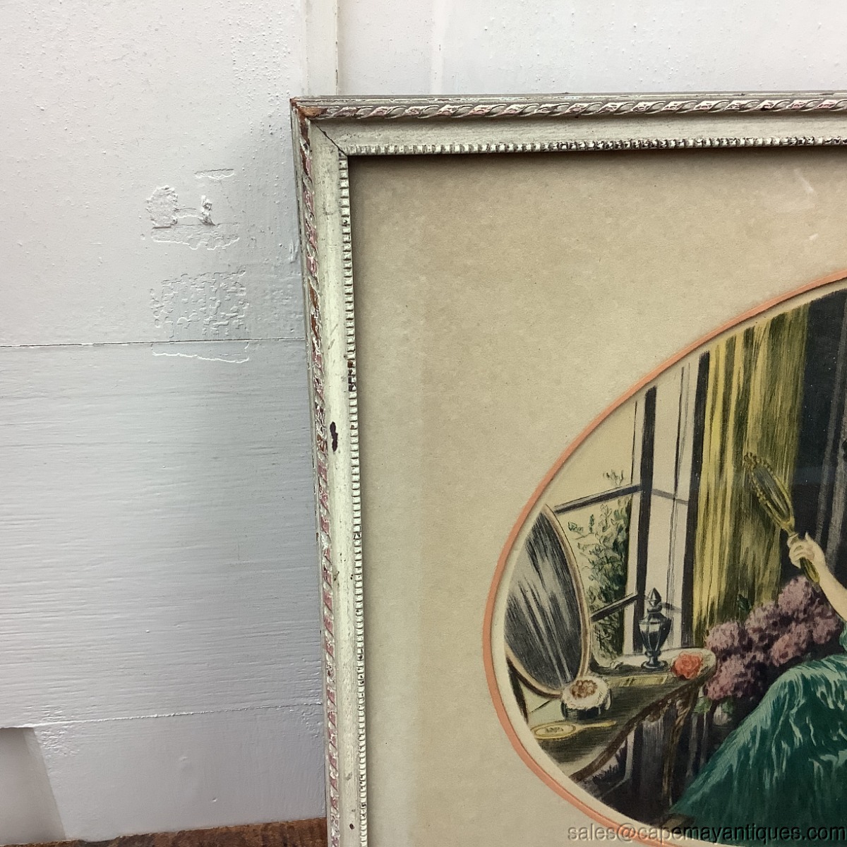 Lovely antique or vintage print featuring an art deco scene, female in gown and vanity. She is fixing her hair with her hand mirror in place. Gorgeous green teal gown with flower in her hair. The print is copyrighted with a pencil signature at the base of the oval print above matting, but it is illegible to me. The frame measures 14.75" wide by 11.5" tall. The print is 11"wide by 8.5" tall. The frame has lots of nicks and loss of cream finish, the print is well protected and in good clean condition under glass.