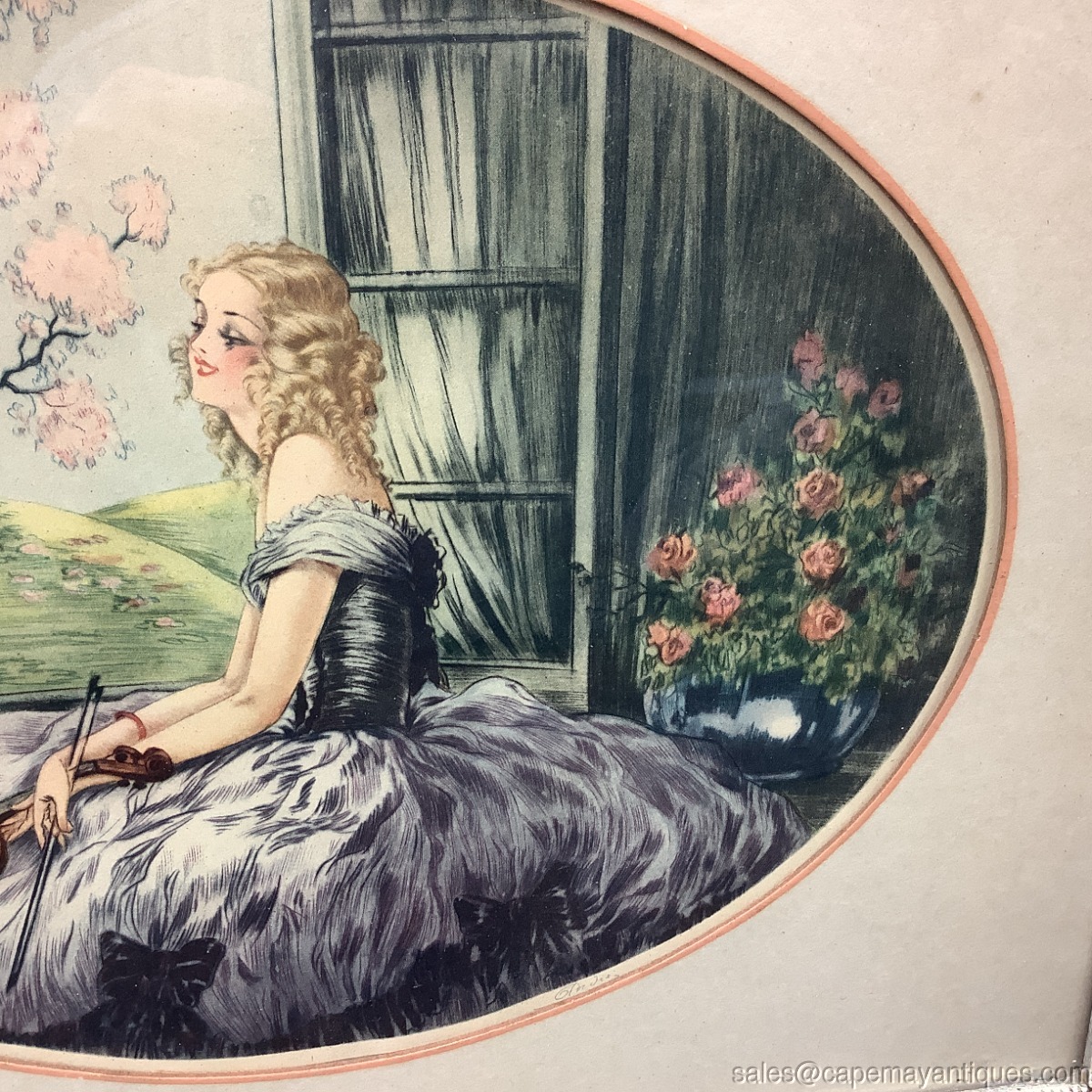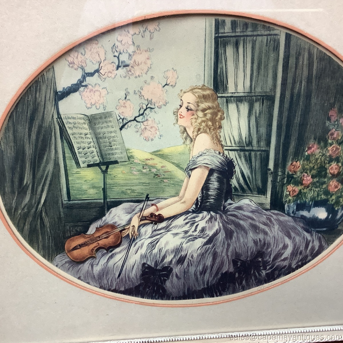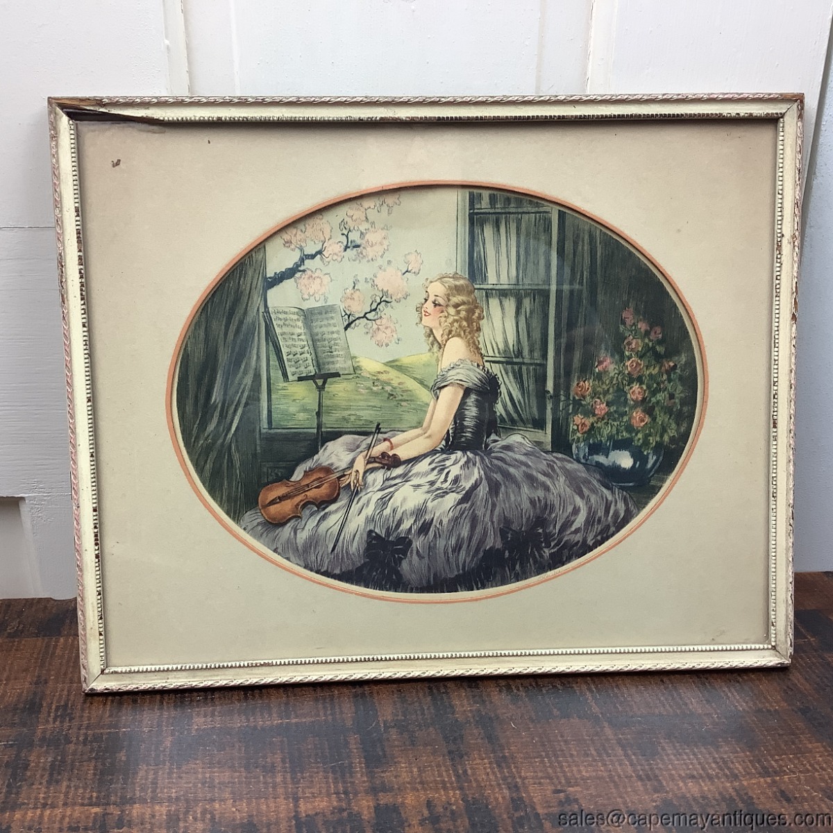 Lovely vintage print, framed and matted under glass featuring a female in a gown holding, playing, a violin as she sits in front of a large window showing a springtime scene. The frame measures 14.75" by 11.5" tall. The oval print is 11" wide by 8.5" tall. There is a copyright mark and a pencil signature at edge of matting. I cannot make out the signature and I cannot identify original artist. The print is in good condition but the frame has a missing chunk from upper left hand side. See images. Some loss of coloring to the white frame and some beaded trim missing. Print is well preserved.