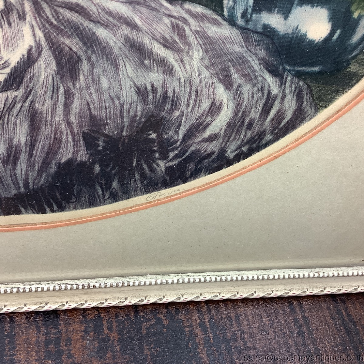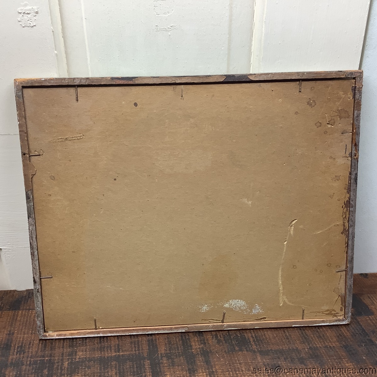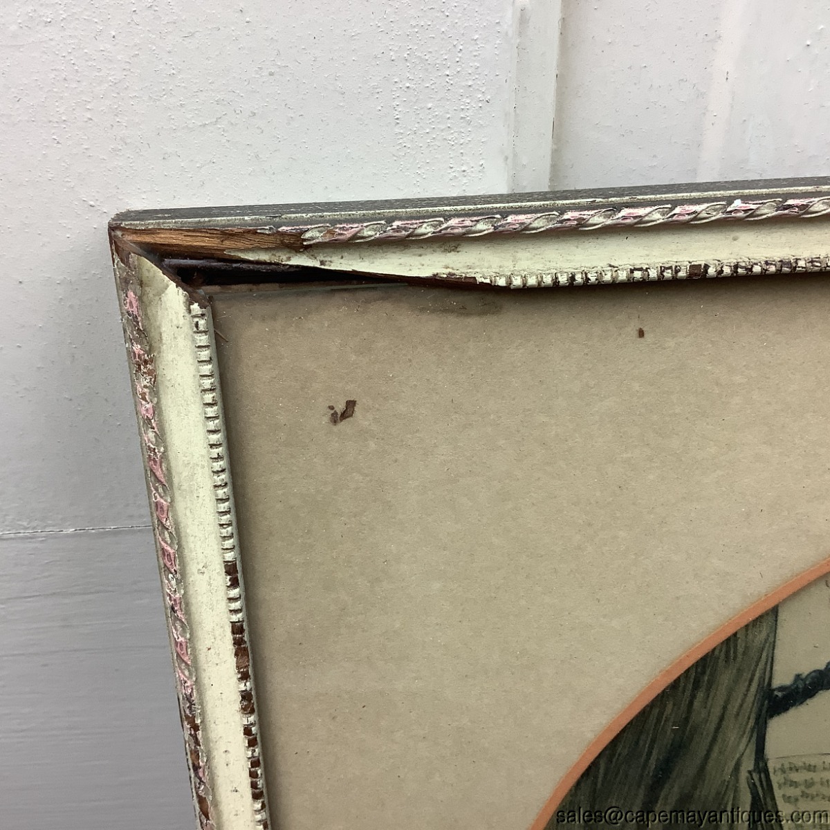 Lovely vintage print, framed and matted under glass featuring a female in a gown holding, playing, a violin as she sits in front of a large window showing a springtime scene. The frame measures 14.75" by 11.5" tall. The oval print is 11" wide by 8.5" tall. There is a copyright mark and a pencil signature at edge of matting. I cannot make out the signature and I cannot identify original artist. The print is in good condition but the frame has a missing chunk from upper left hand side. See images. Some loss of coloring to the white frame and some beaded trim missing. Print is well preserved.