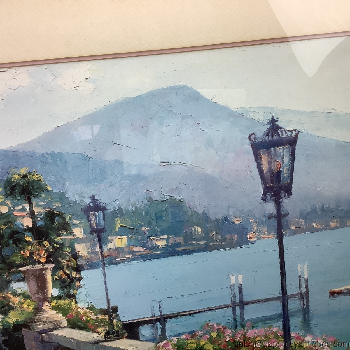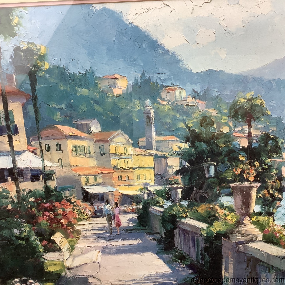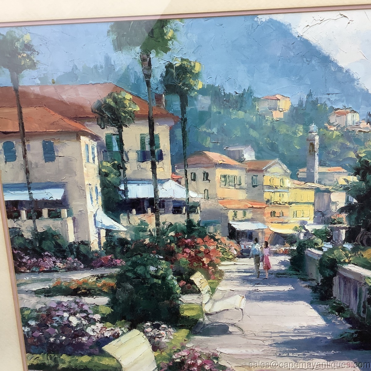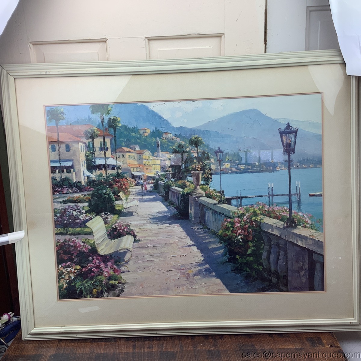 Lovely vintage framed print called Bellagio Promenade. The original is by Howard Behrens. The cream colored wood frame measures 31" by 39". The print is 30" by 21.5". Nicely matted and under glass. There are few scuffs and marks on the frame. The matting is in good condition. Slight discoloration upper top left section from age. Wish I was there!