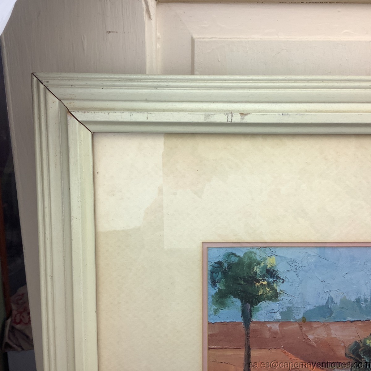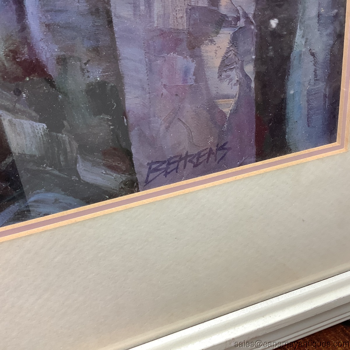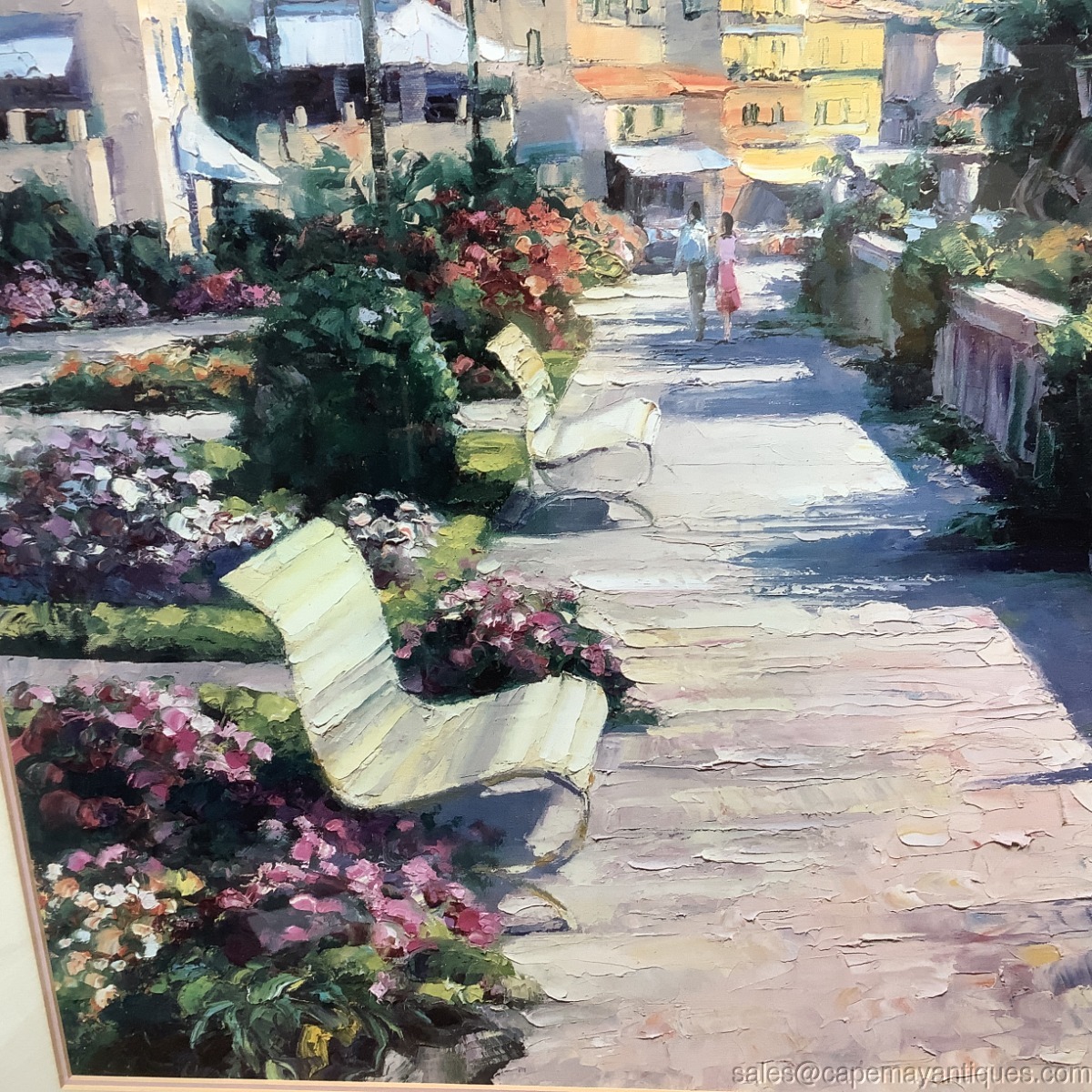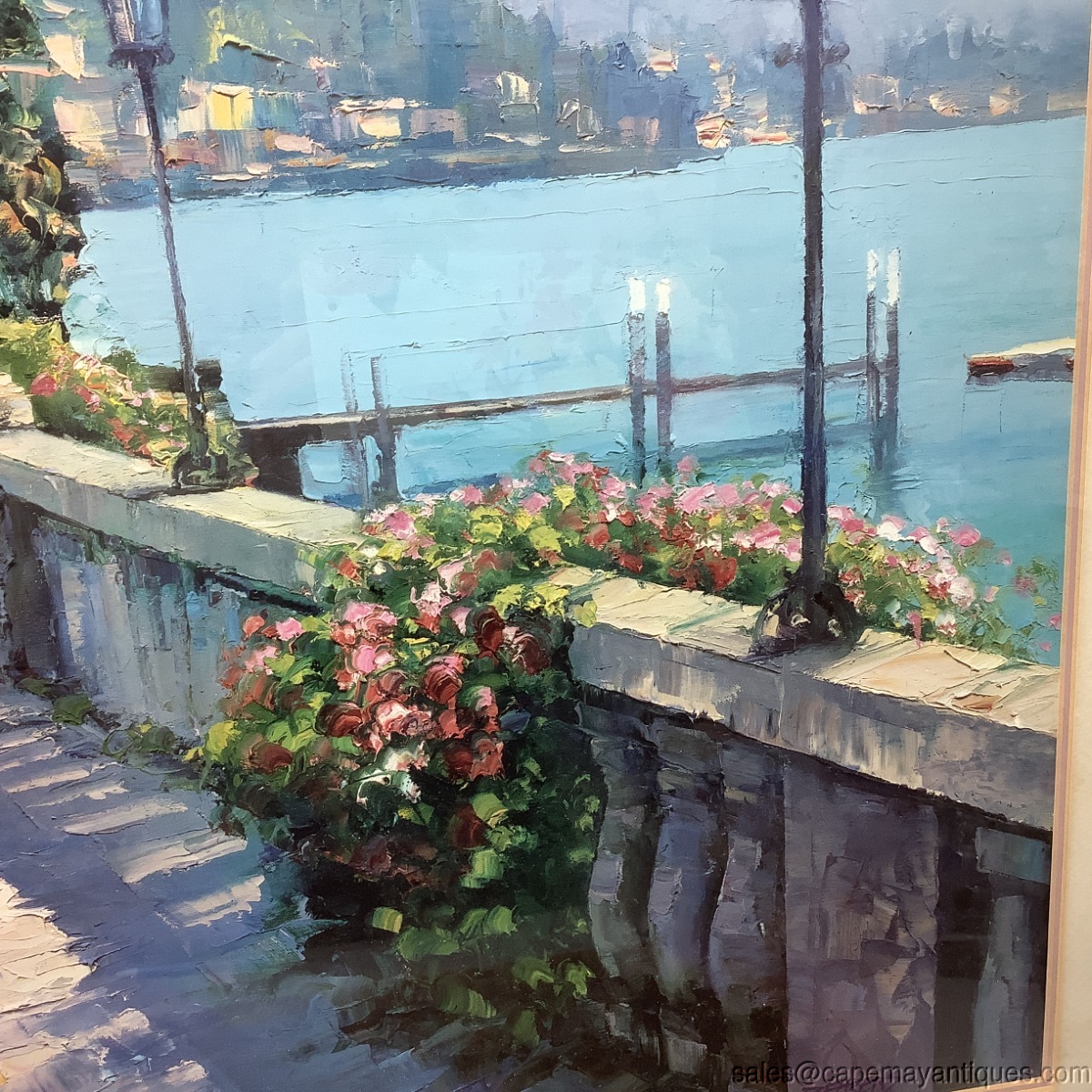 Lovely vintage framed print called Bellagio Promenade. The original is by Howard Behrens. The cream colored wood frame measures 31" by 39". The print is 30" by 21.5". Nicely matted and under glass. There are few scuffs and marks on the frame. The matting is in good condition. Slight discoloration upper top left section from age. Wish I was there!