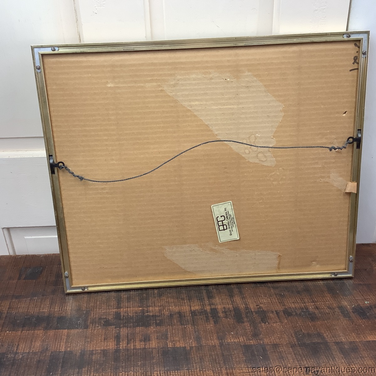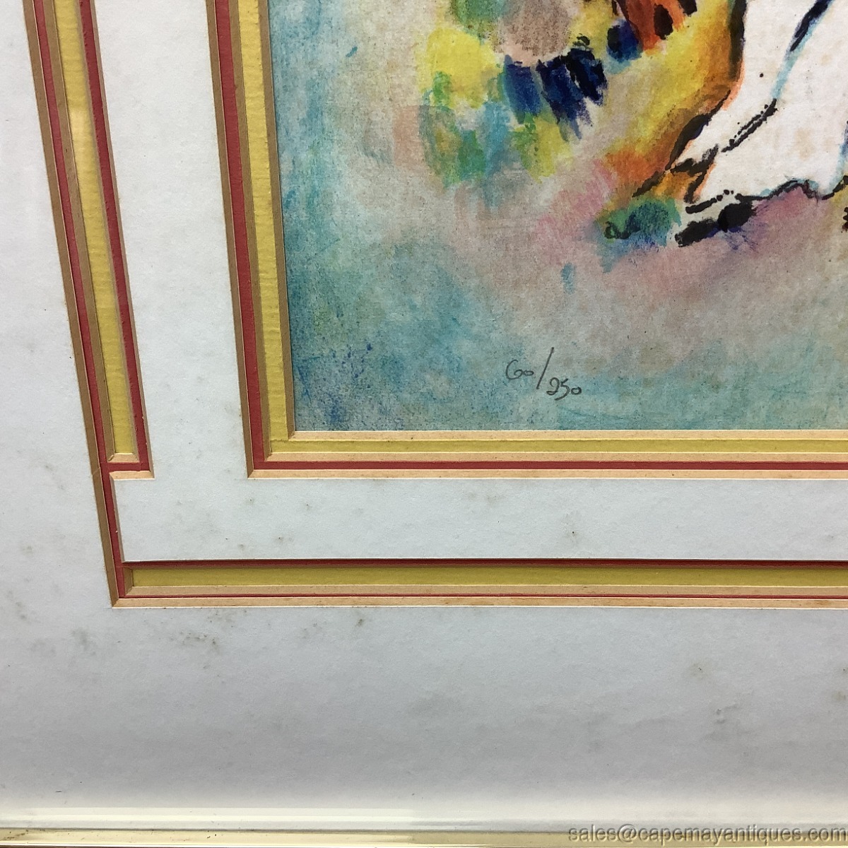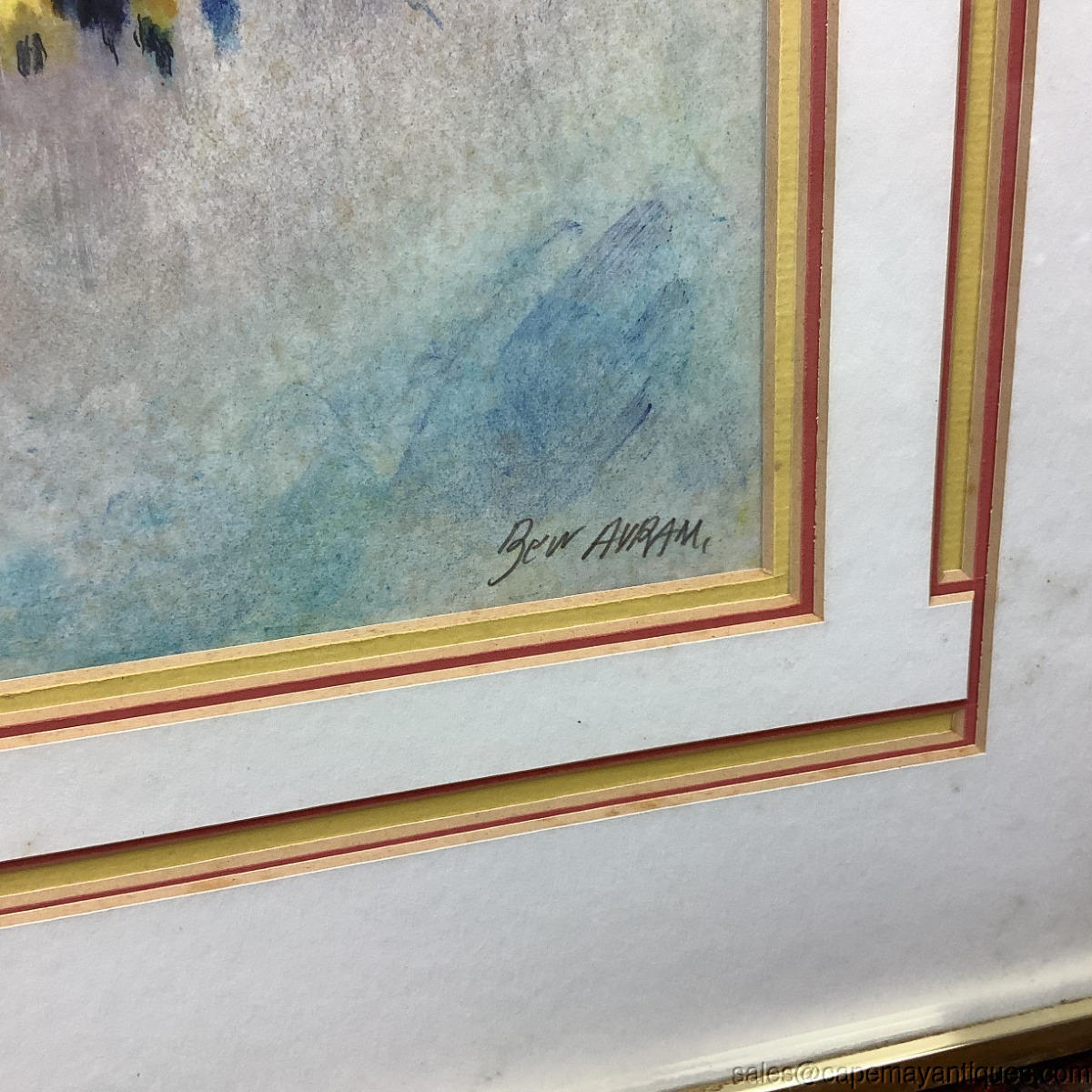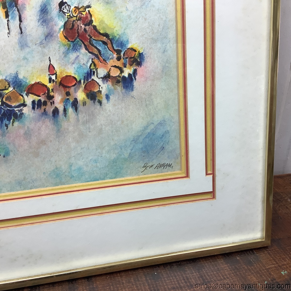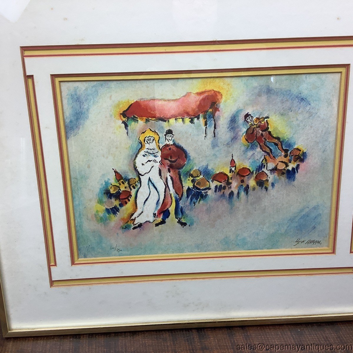 Signed and numbered lithograph print by Ben Avram. Numbered 60 over 250. The print is Chuppah depicting a traditional Jewish wedding canopy scene, characteristic of the artist's vibrant dreamlike style. Pastel colors and shades with unique floating figures over top of the city. Violin player off to the right as well. Very unique matting as well in yellow with red highlights in a geometric design. The artwork is protected under glass. The gold frame measures 21.5" by 17.5". The artwork is 13" by 9". The artwork is not damaged at all but there is foxing under the glass in the upper right hand corner and left hand corner. Needs to be taken apart and cleaned to removing the discoloration. No rips or tears, frame has some marks and is not the best quality.
