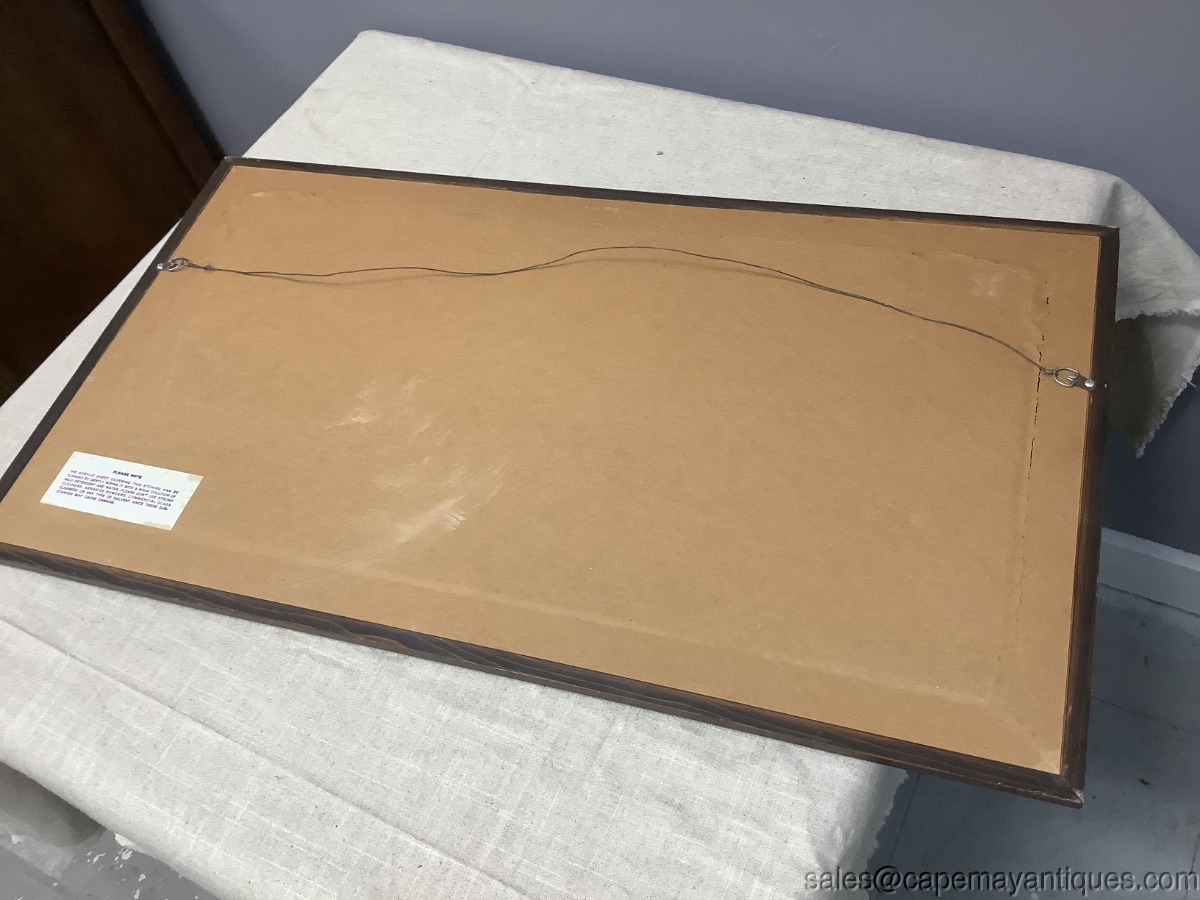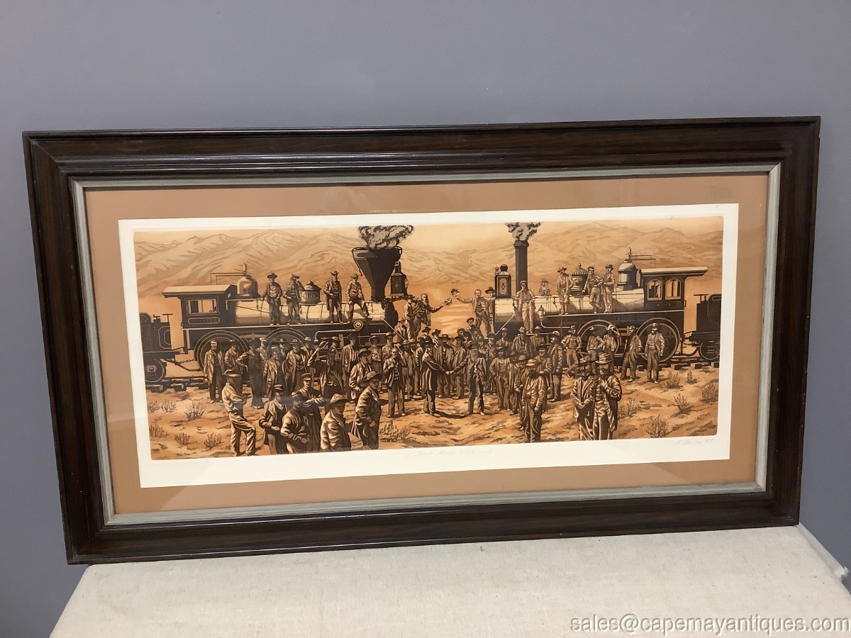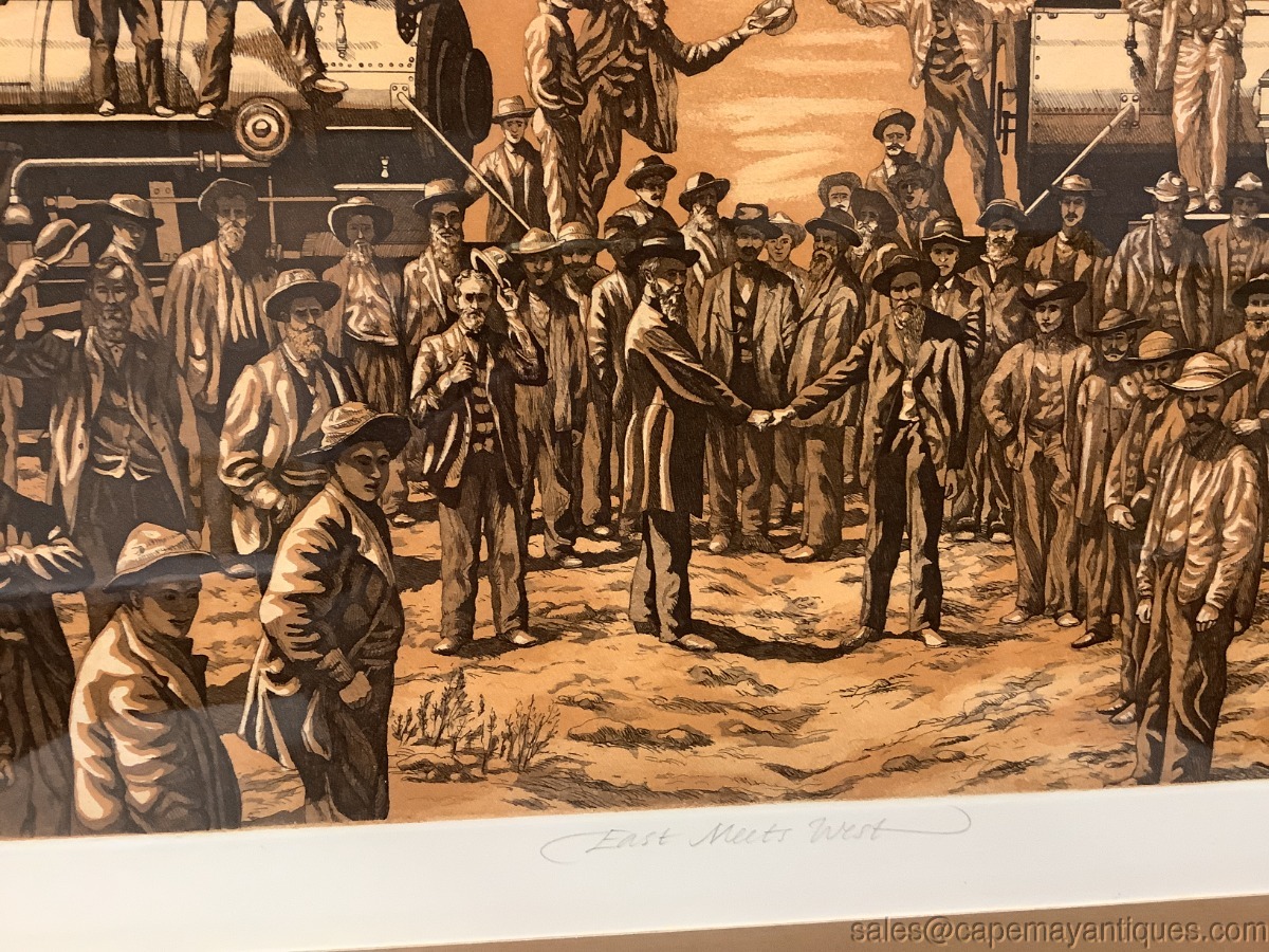 Lovely vintage pencil signed print of East Meets West which depicts the Golden Spike Ceremony of the First Transcontinental Railroad completion in 1869. This is a limited edition print signed and dated by the artist Kathleen Cantin 1977. Framed and matted. Frame is 32.25" by 18" tall. The print is 25" by 11.5" including the white border section. Some minor nicks on the wood frame but print is un very good condition under glass.