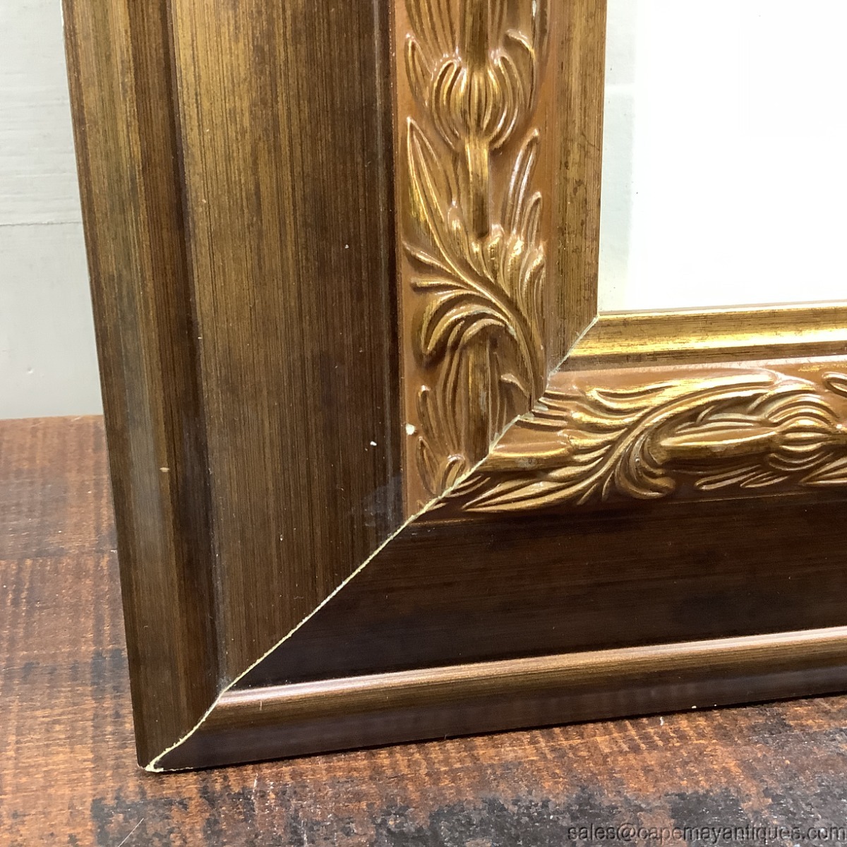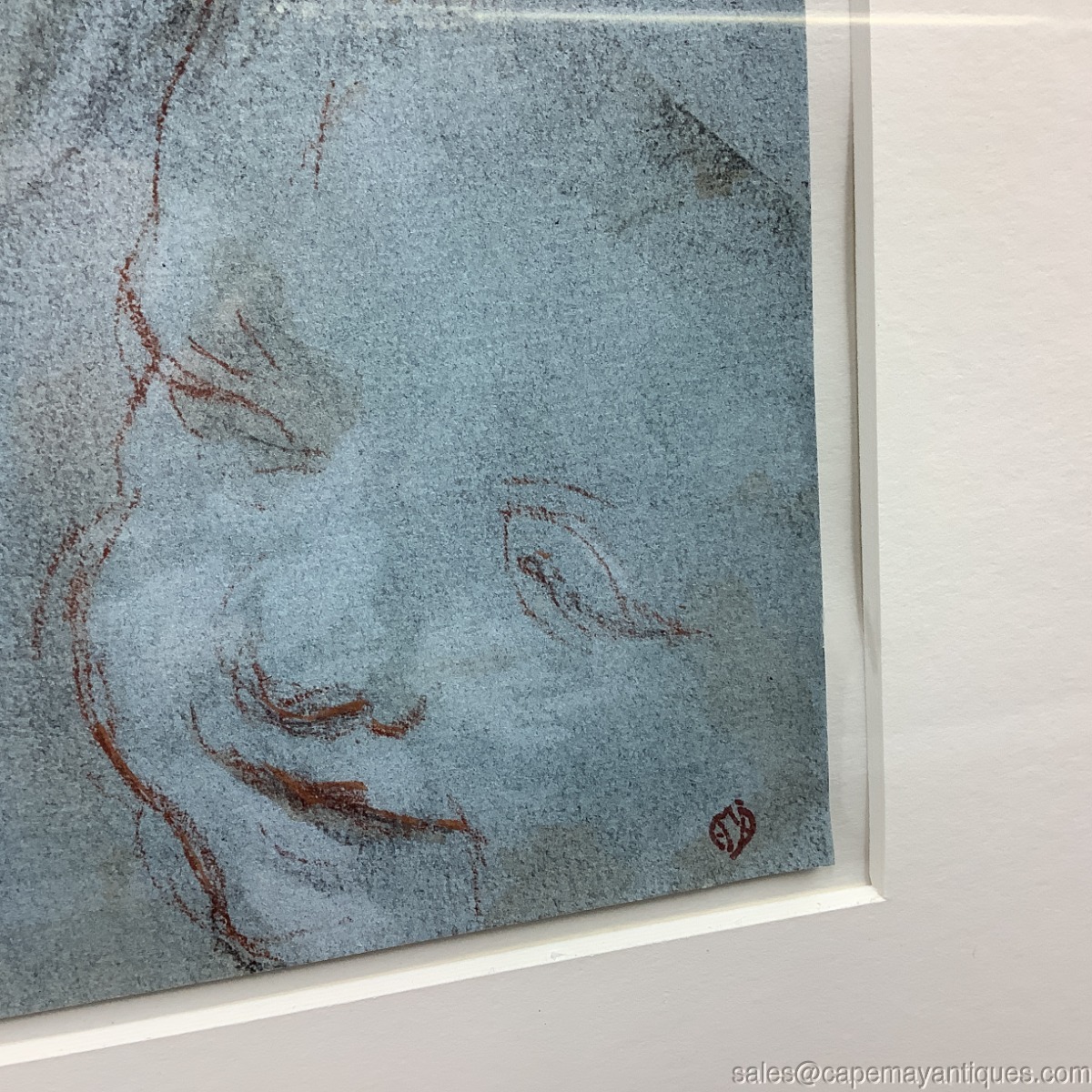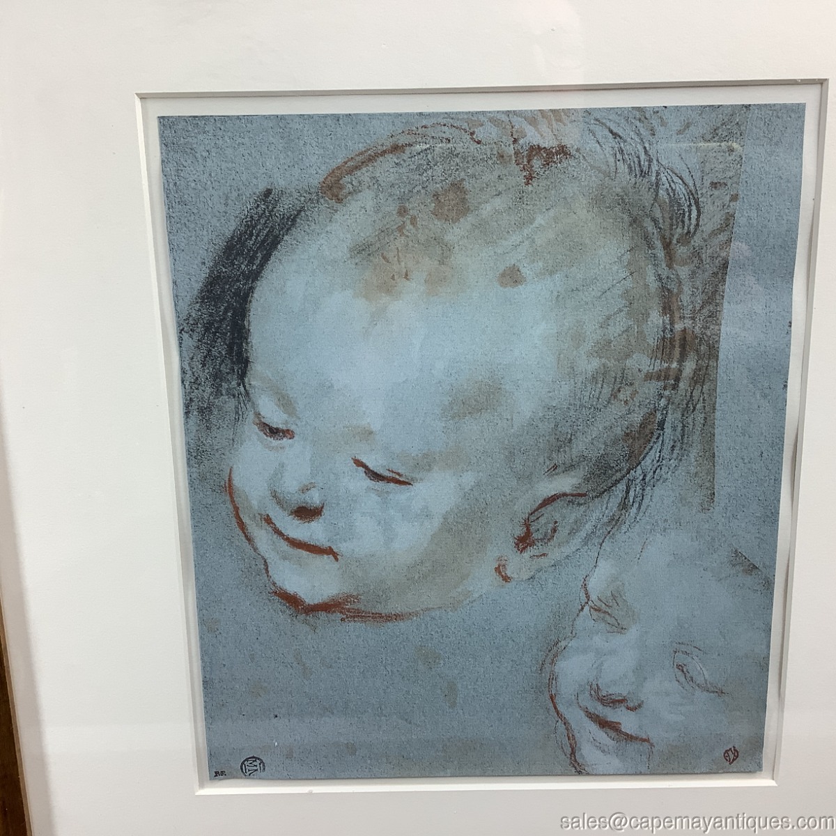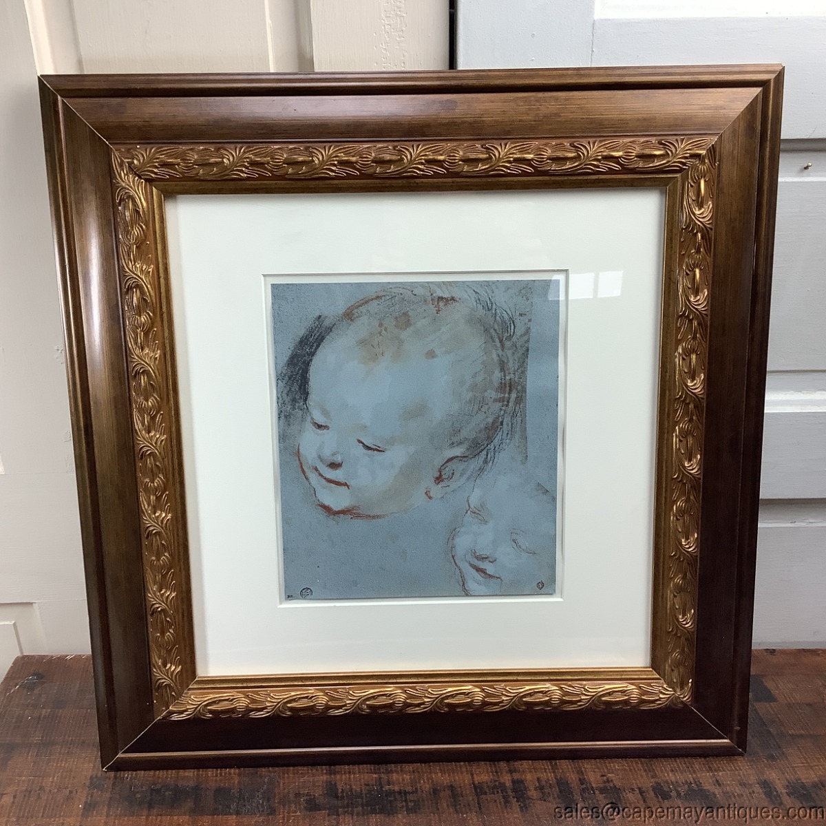 Lovely print, reproduced, of Tete D'Enfant, baby print by Frederico Barocci (1528-1612). Gold and brown residn, faux wood frame is 24" by 23.25". Print is 10.75" by 9.5". Print is protected under glass some minor raising of the print on right hand side. See images, very well preserved and cared for print and frame. Few tiny marks and chips on the resin frame on upper corners and seems. See images.