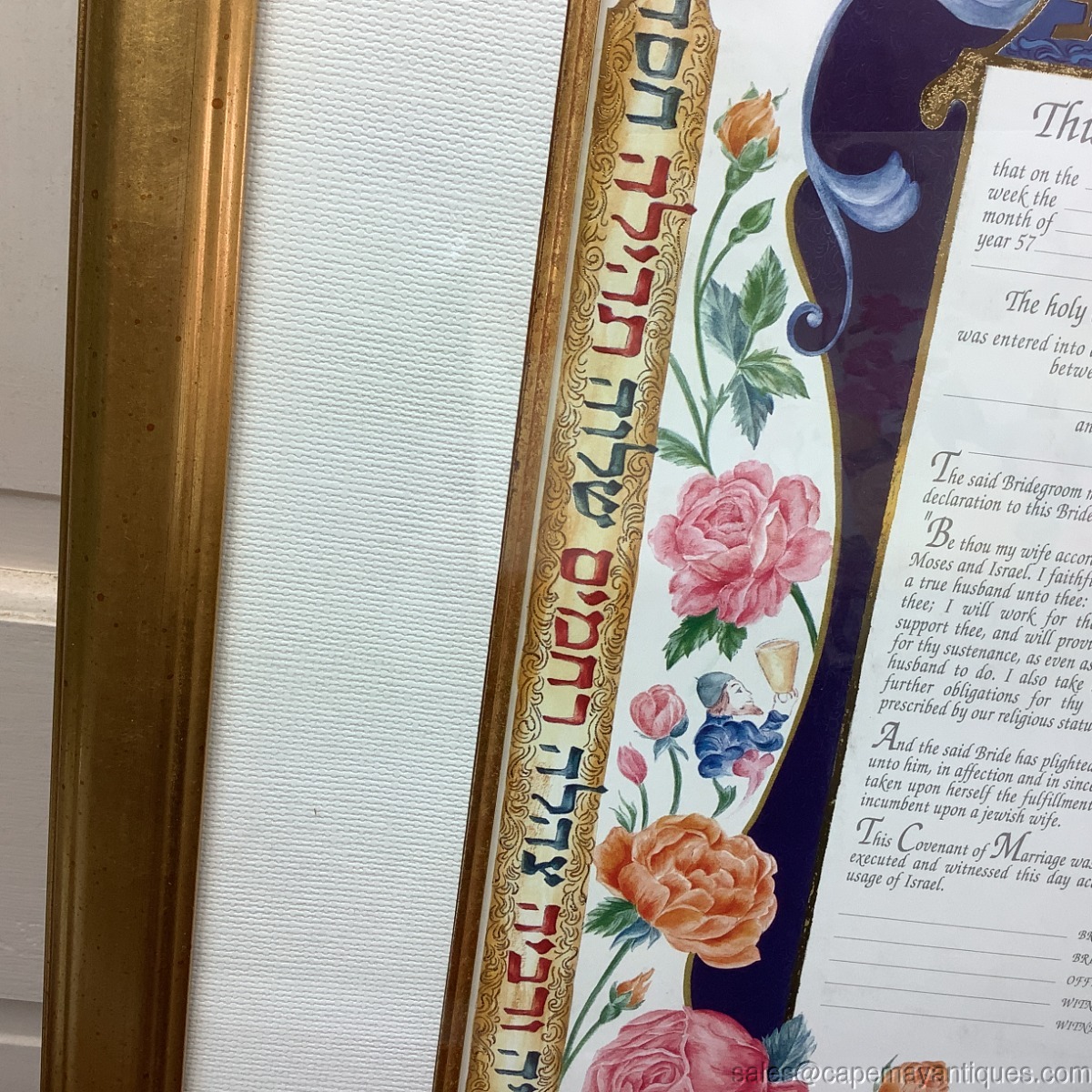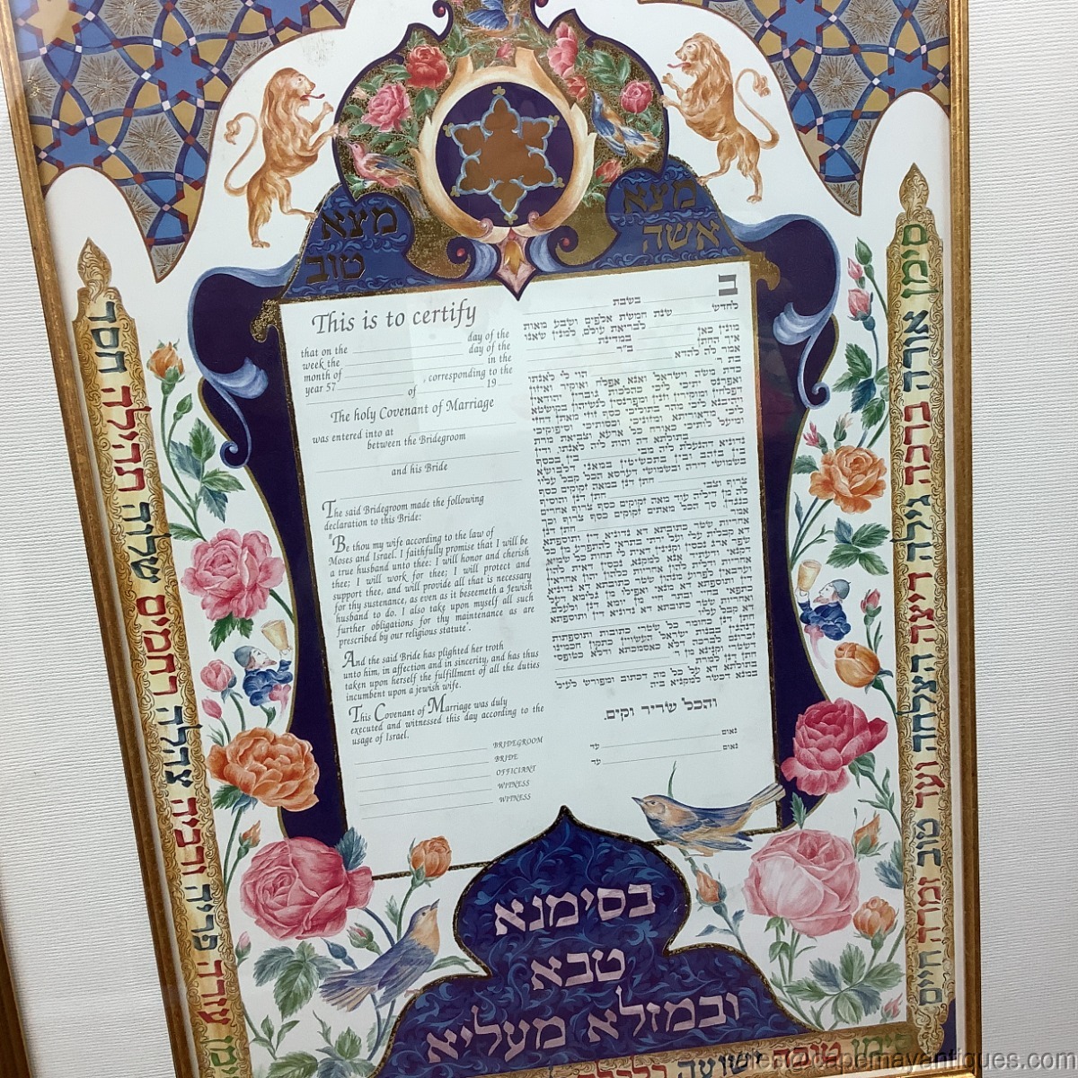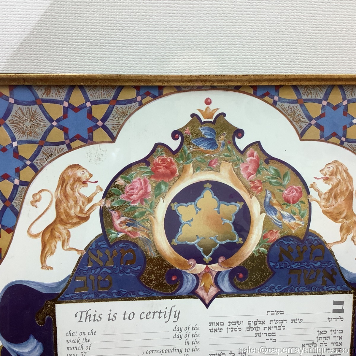Amazing framed, under glass and beautifully matted blank marriage contract or Shir Hashirim Ketubah. The artist is the famous Amalya Nini. The frame measures 24.5" by 19.25". The actual certificate is 18" by 12.5". Vivid, bold patterns featuring blue, gold, stars and pair of lions are perched atop of the contract. Entirely blank. Good clean condition with no damage. Worthy of use or gift giving.