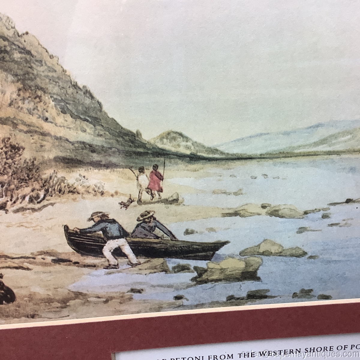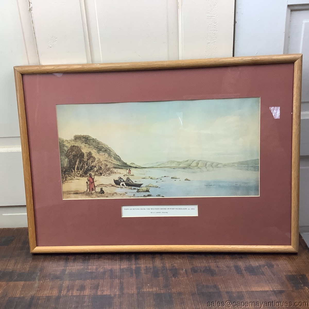 Vintage framed, matted well preserved print entitled View of Petoni From the Western Shore of Port Nicholson ca. 1843 by SC Brees 1810-65. It features a small boat being pushed ashore with robed man and child watching. Pretty vistas of rolling hills and port. Simple blue white muted sky. Wood frame measures 25" by 17.5" tall. The print itself is 18" by 8.75" tall. Very good clean condition all protected under glass. Few scuffs on the wood frame. Overall, so pretty and peaceful.