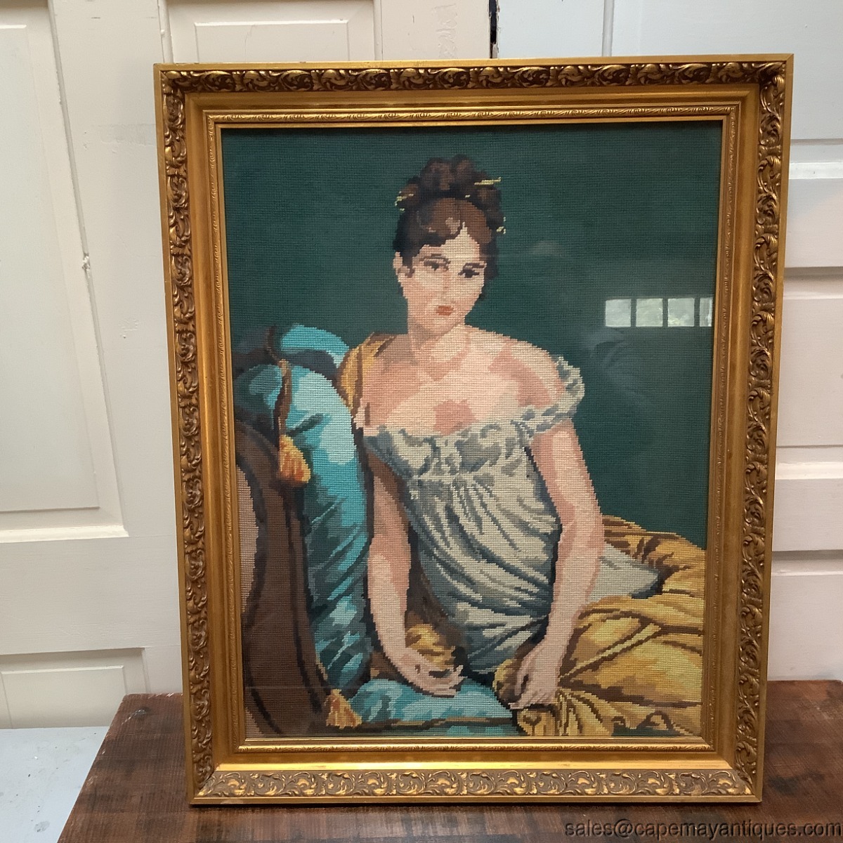 French Needlepoint Woman Portrait Juliette Recamier Romantic Pose Gold Frame