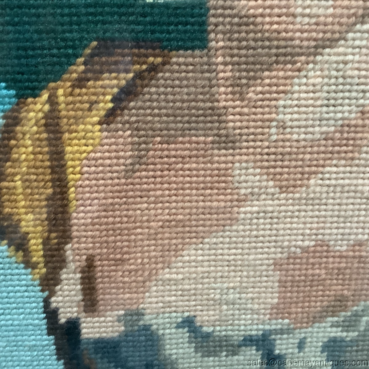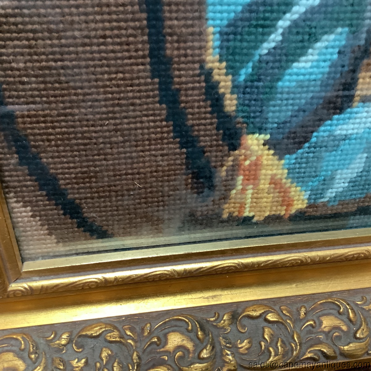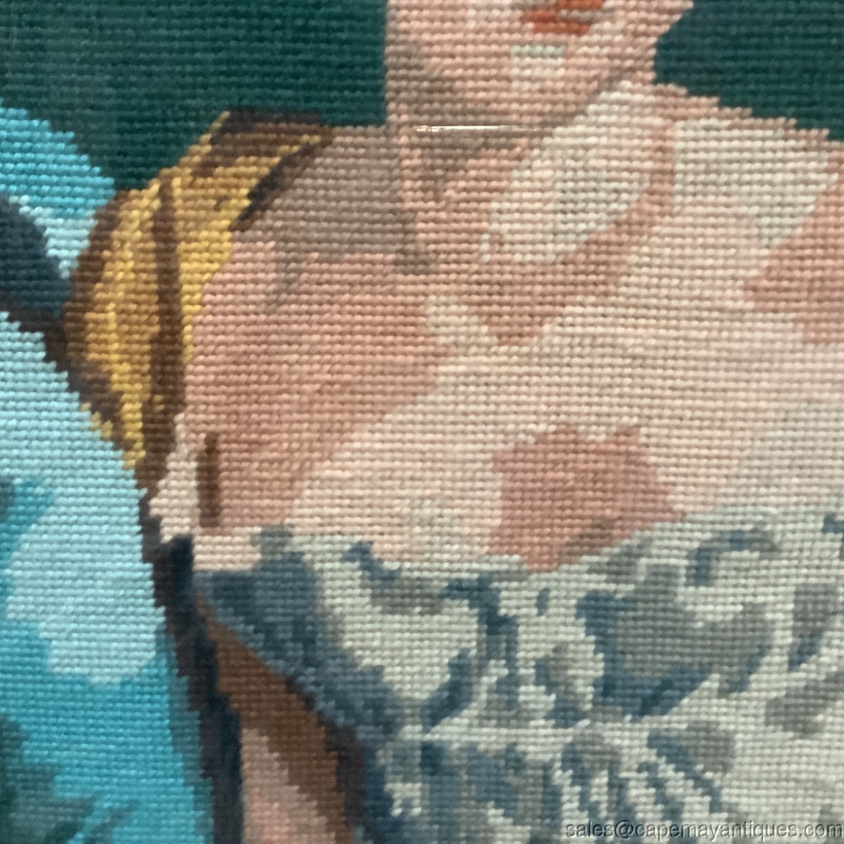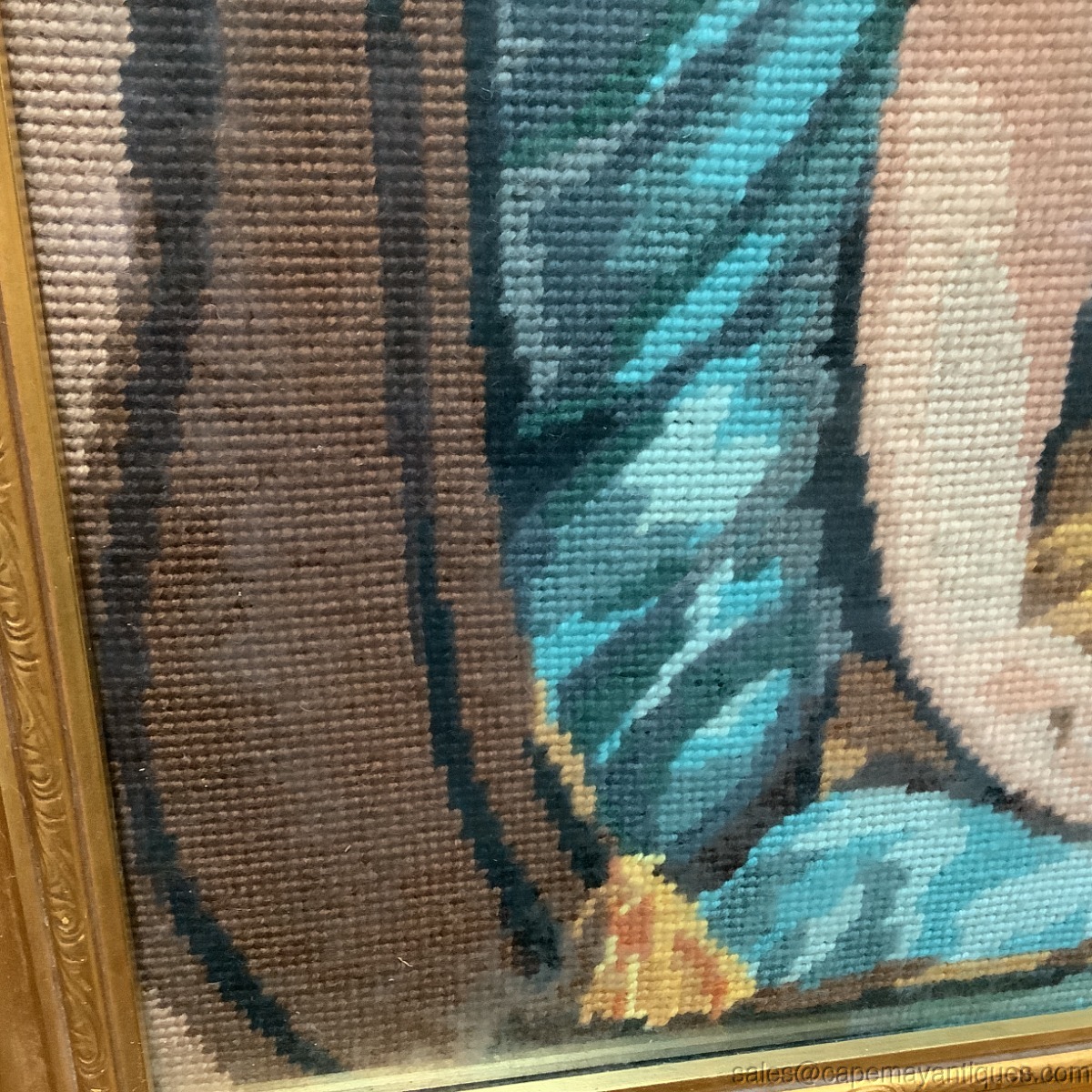 French Needlepoint Woman Portrait Juliette Recamier Romantic Pose Ornate Frame. Gold frame measures 30" by 24" and the needlepoint that is revealed under glass is 25.5" by 19.5", might be larger and hidden behind frame. Gorgeous green blue background with a tight needlepoint pattern, crisply finished with no pulls or damage to the needlepoint. The fiber is under glass and I see a slight sheen on the underside of glass probably from age and would most likely clean up. Really only shows under bright natural light. Gorgeous piece as well as frame.