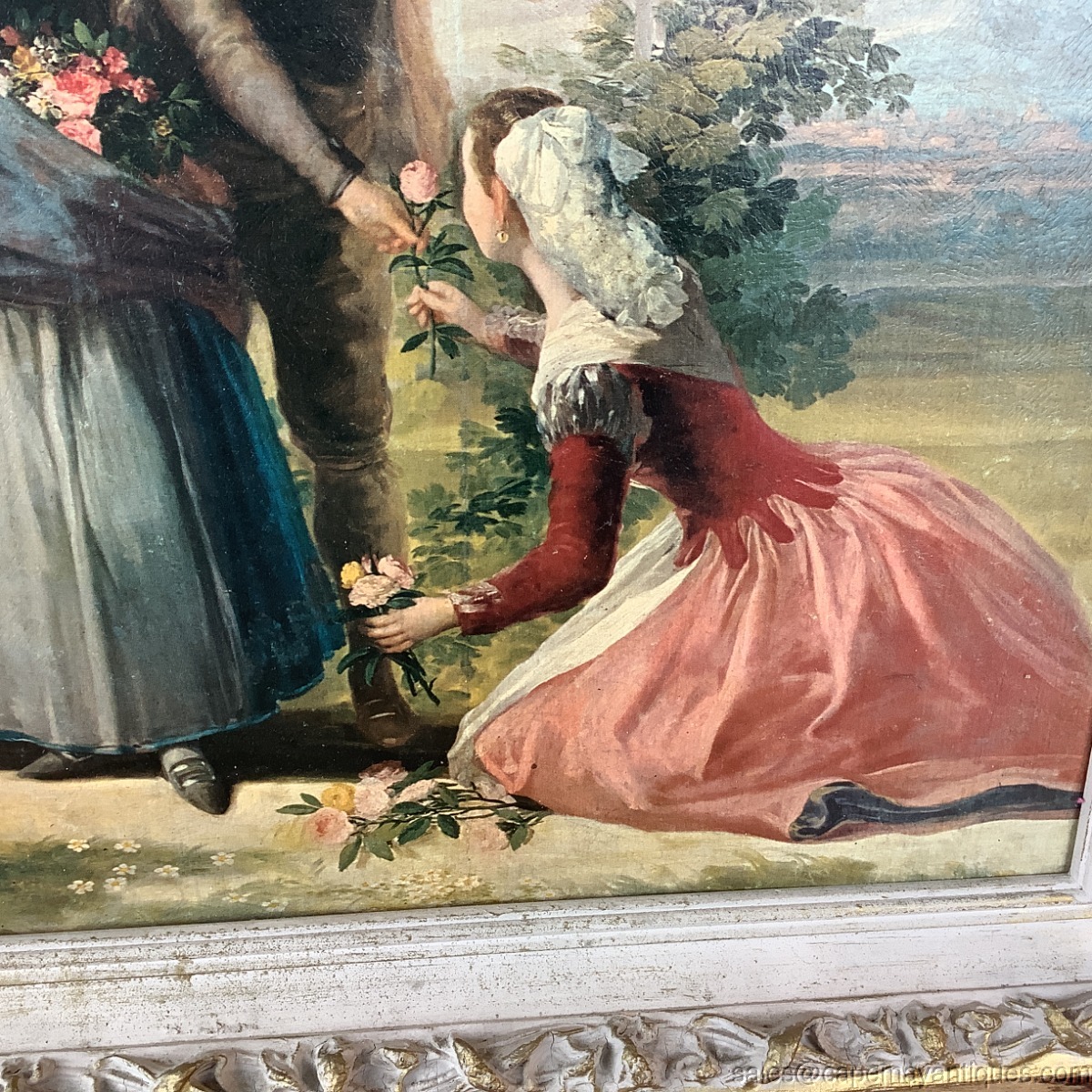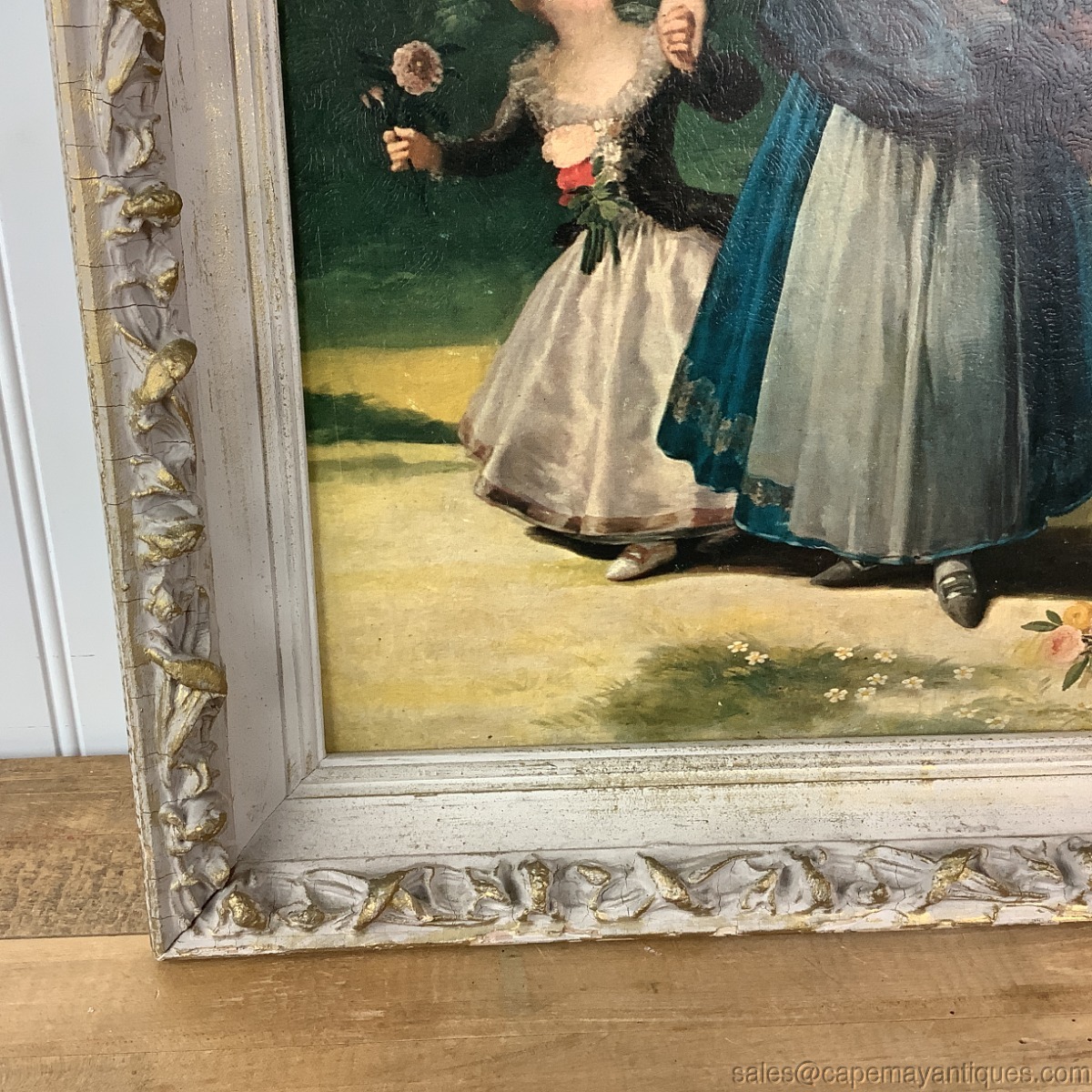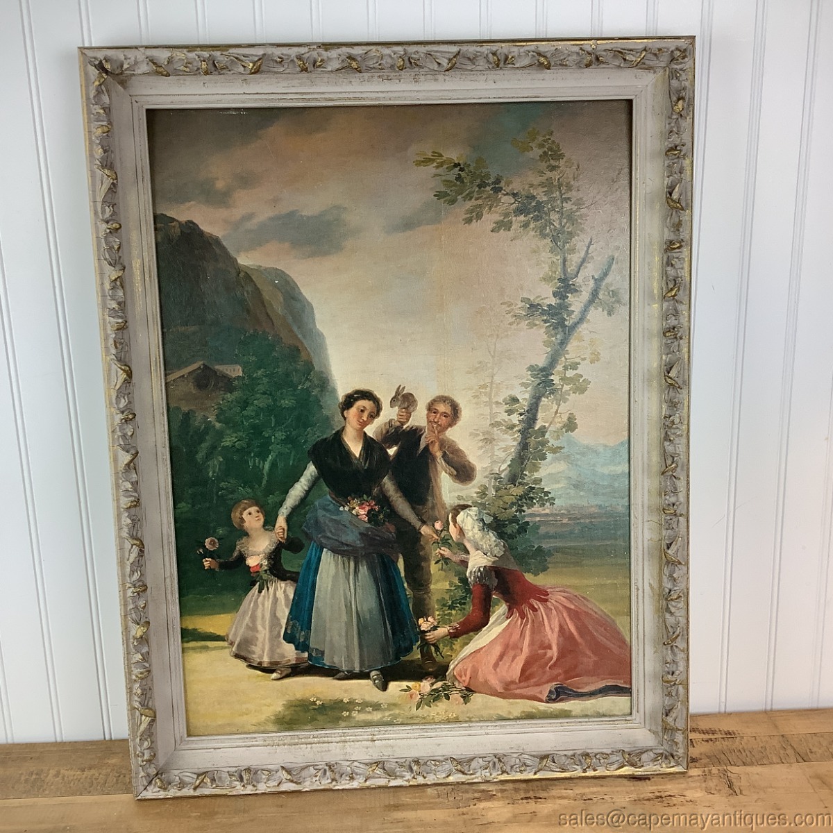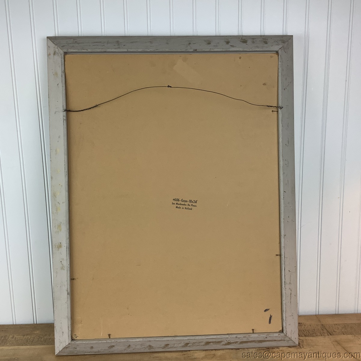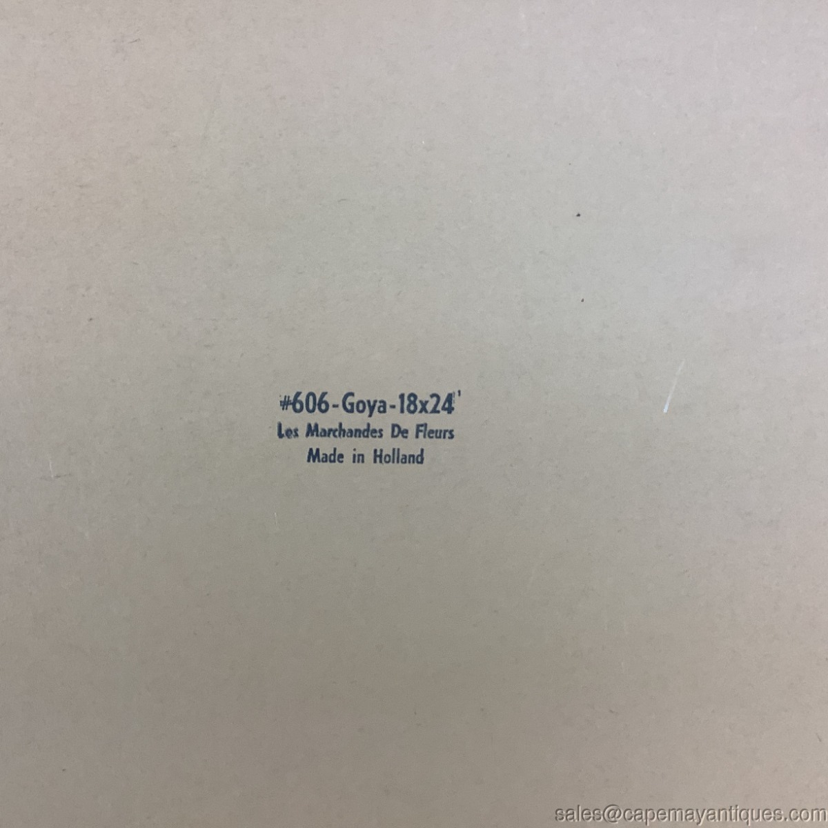 Made in Holland stamp on back with the title Les Marchandes De Fleurs. Also known as Spring or Flower Girls by Goya. Depicts 16th Century exterior scene with mountains in the background, 2 young girls with the flower merchant with a man holding a rabbit behind the lady. Colorful, whimsical and Romantic as well. Frame is a carved wood with gold accents and measures 21" by 27" tall. The print on thick paper or thick cardboard is 24" by 18". The frame is in good condition. The artwork is clean but does have a slight bend at the upper section showing an opening between the art and frame. We pressed it out lightly with heavy books on the back and it made quite a difference so might need a bit more manipulation. Few tiny specks of white in the skyline area and upper border of the art where it meets the frame. Such a dreamy, pretty scene.