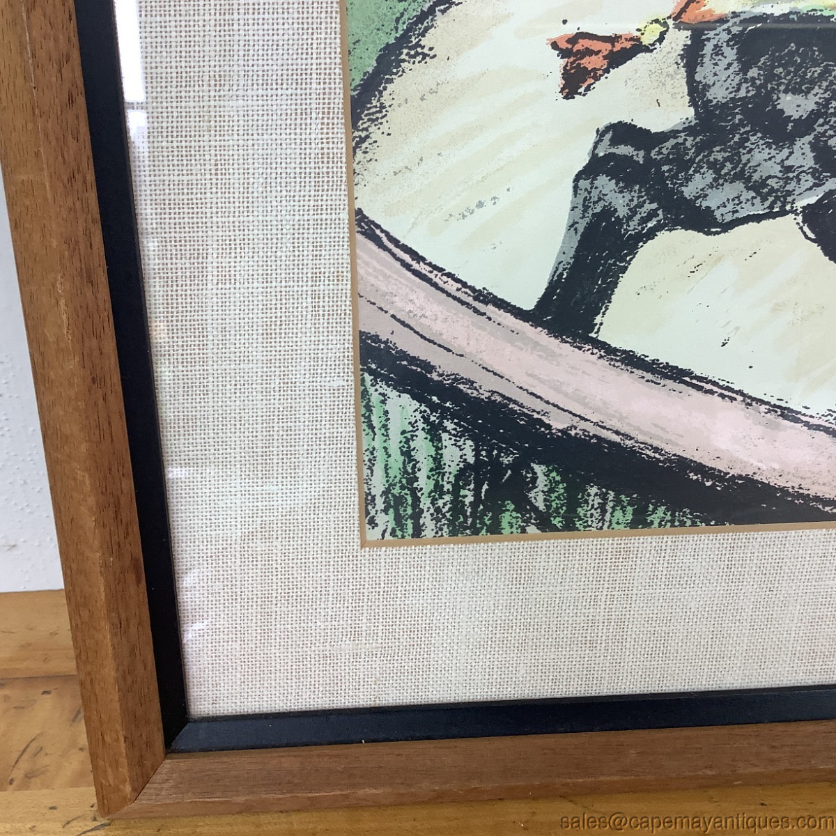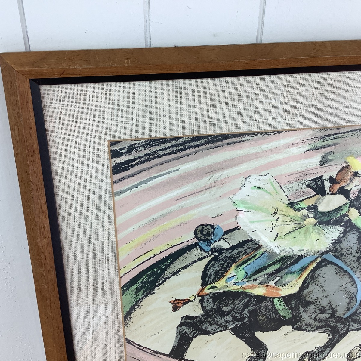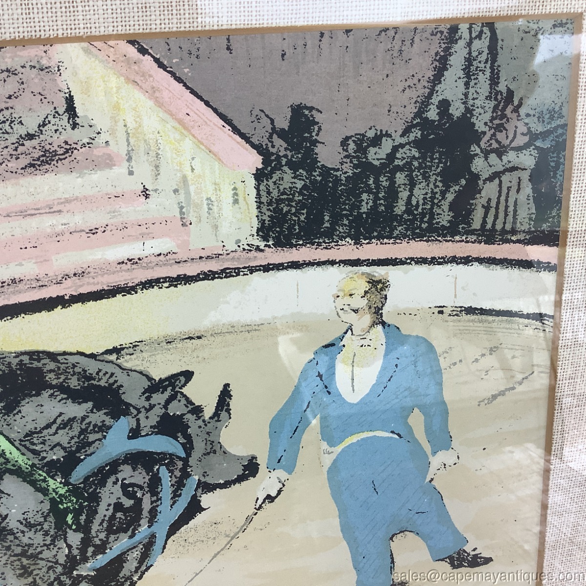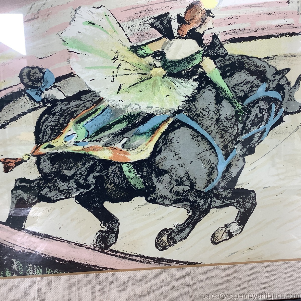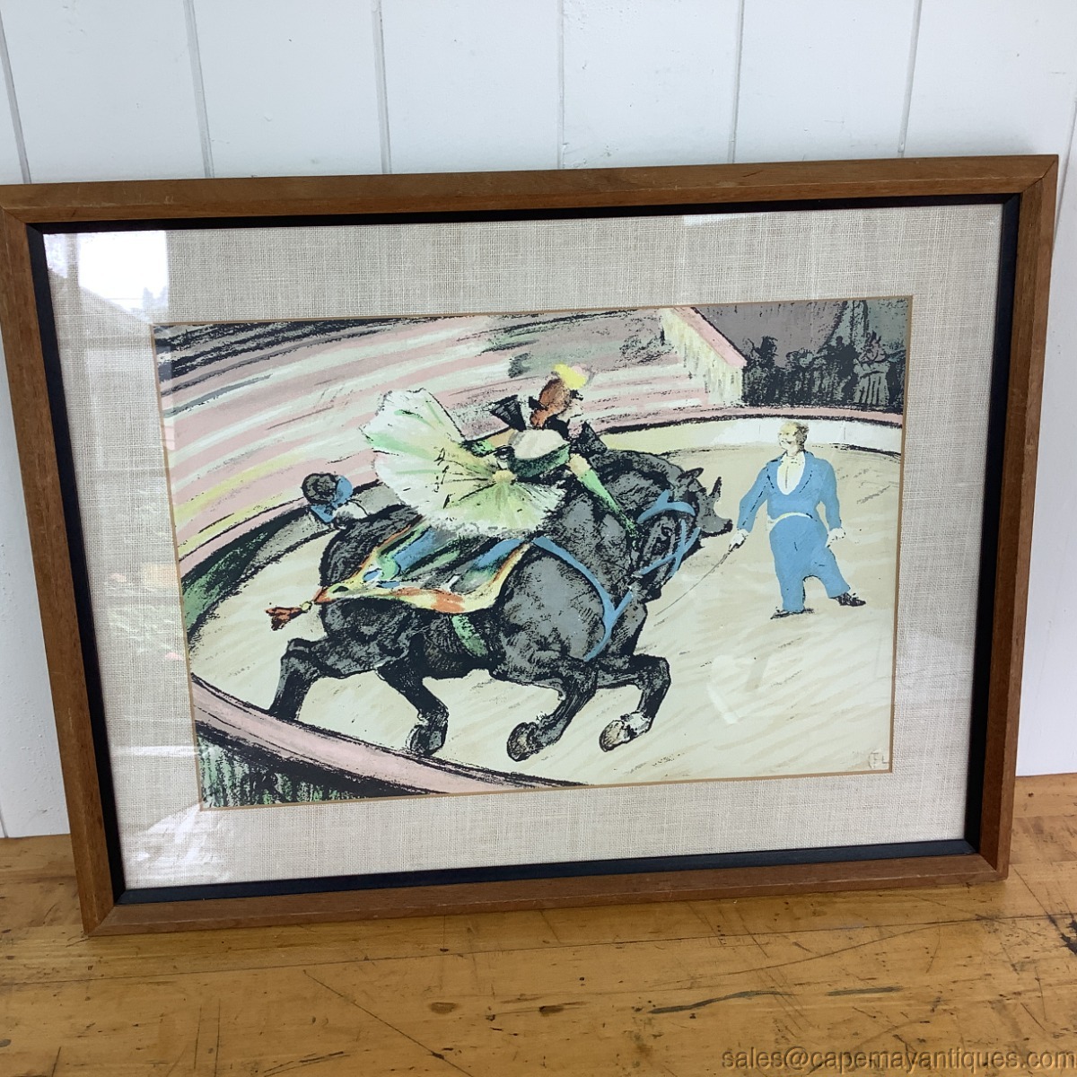 Vintage framed, matted under glass lithograph print fully entitled At the Circus: Work in the Ring. Original work created 1888 portraying an equestrian performer at the Cirque Fernando, a popular Parisian circus. Frame measures 22" length by 16.75" tall. The artwork is 16" by 11" tall. Wood frame with inner black trim and a linen matting wide border. The print is under glass with very good coloring. Swirl of pink and white depicting the circus ring. Black shaded horse with blue harness. Frame and print are in very good condition. HTL in circle bottom right portion of print used for his fine art prints. Sorry about the glare in the images. Priced nicely at $350, well under $700 values I am finding in my searches.