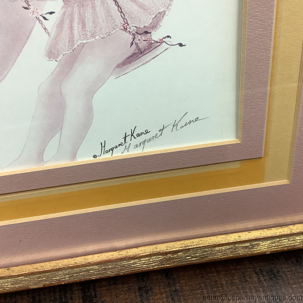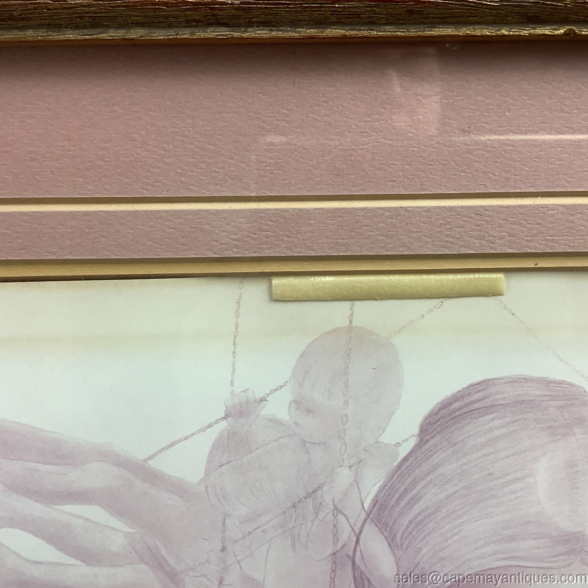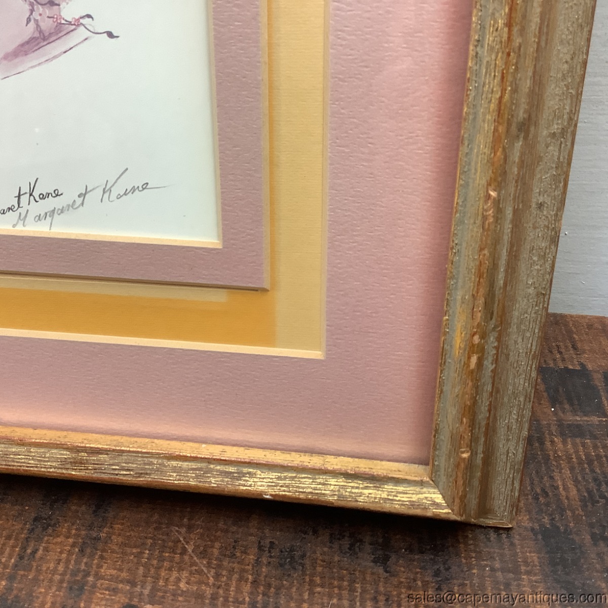 Lovely pencil signed by Margaret Kane. Title is Circle of Life. Gold wood frame measures 21" by 18". The print under glass is 10.5" by 13.5". The print has slipped from it's matting or the matting has slipped from the print. you can see some tape on side and top that held the inner matting trim in place. Some minor discoloration from the slippage. See up close images. Otherwise, good clean condition with no damage.