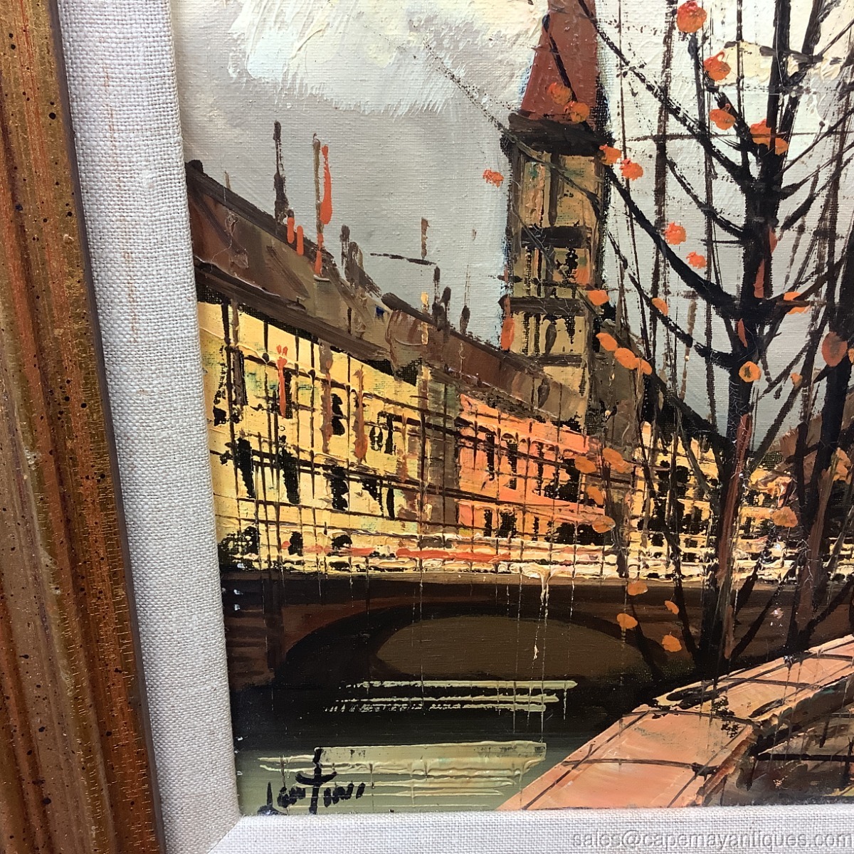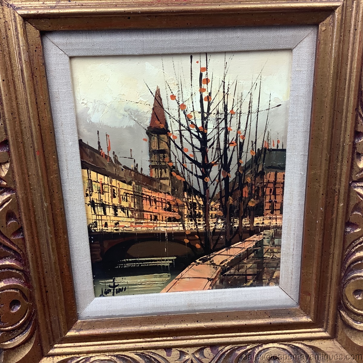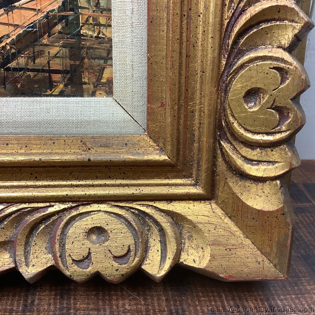 Stunning, Brutalist style MCM Mid Century Modern oil painting on canvas. Signed Lentini bottom left hand corner. European cityscape street scene probably Amsterdam or Paris. Dark moody cloud, orange accents with black shaded bare trees. Gold chunky solid wood frame measures 18.25" by 16.25". The artwork on canvas is 10" by 8". Inner trim of light colored linen. Very good clean condition with no damage to chunky wood frame or canvas. Minor discoloration on inner linen lining. Stunning vintage oil painting.