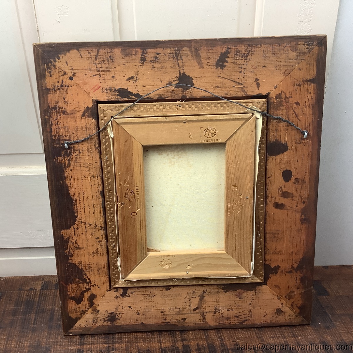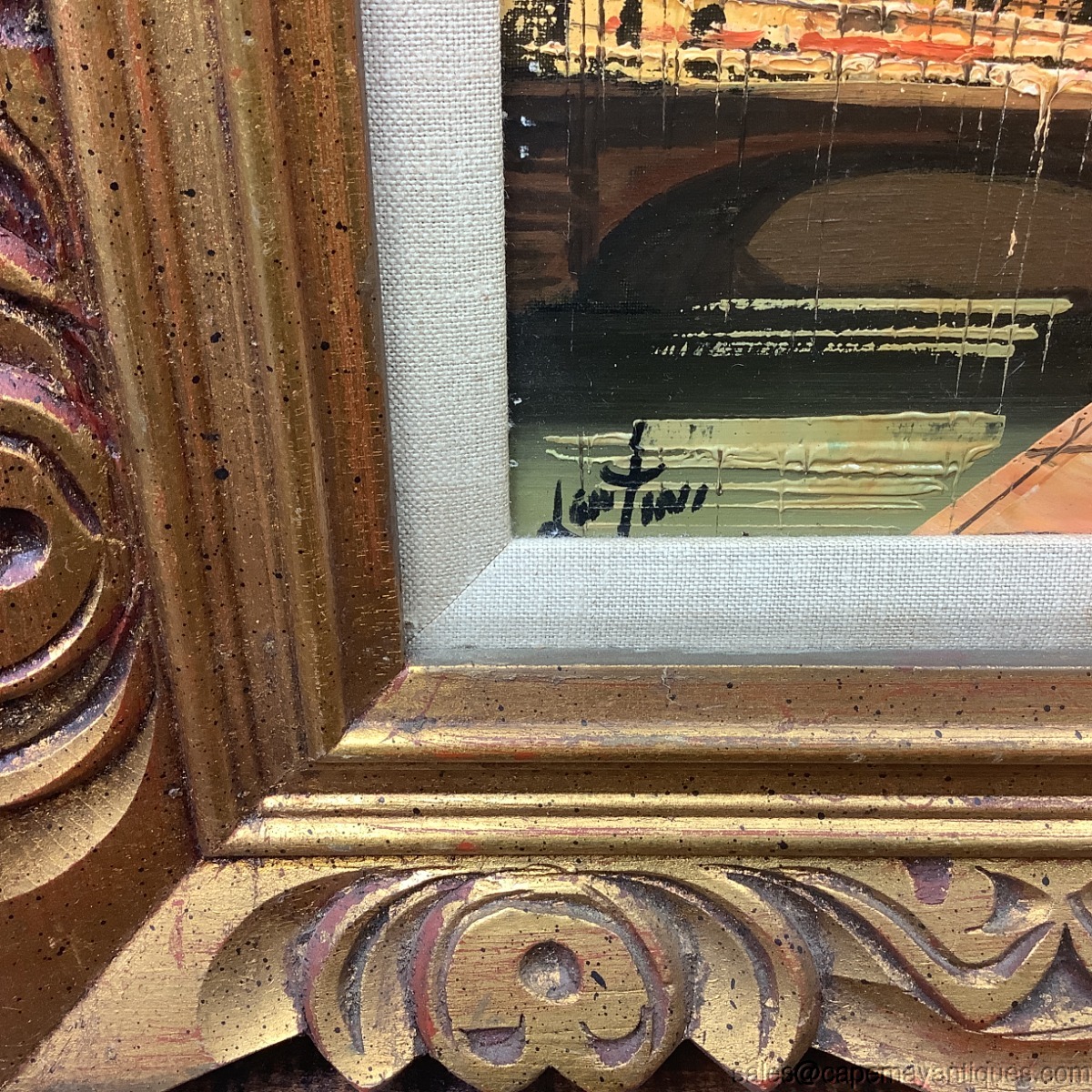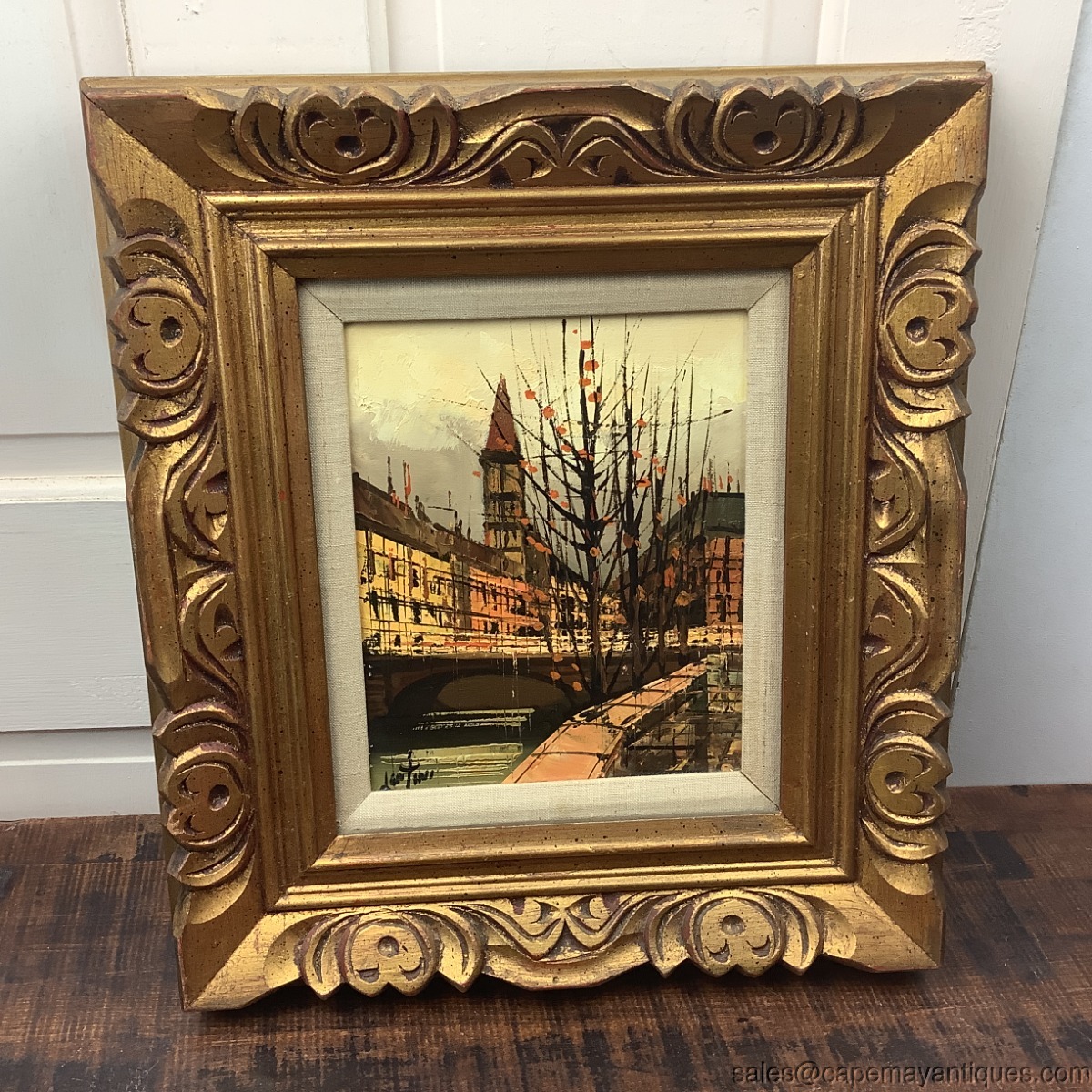 Stunning, Brutalist style MCM Mid Century Modern oil painting on canvas. Signed Lentini bottom left hand corner. European cityscape street scene probably Amsterdam or Paris. Dark moody cloud, orange accents with black shaded bare trees. Gold chunky solid wood frame measures 18.25" by 16.25". The artwork on canvas is 10" by 8". Inner trim of light colored linen. Very good clean condition with no damage to chunky wood frame or canvas. Minor discoloration on inner linen lining. Stunning vintage oil painting.