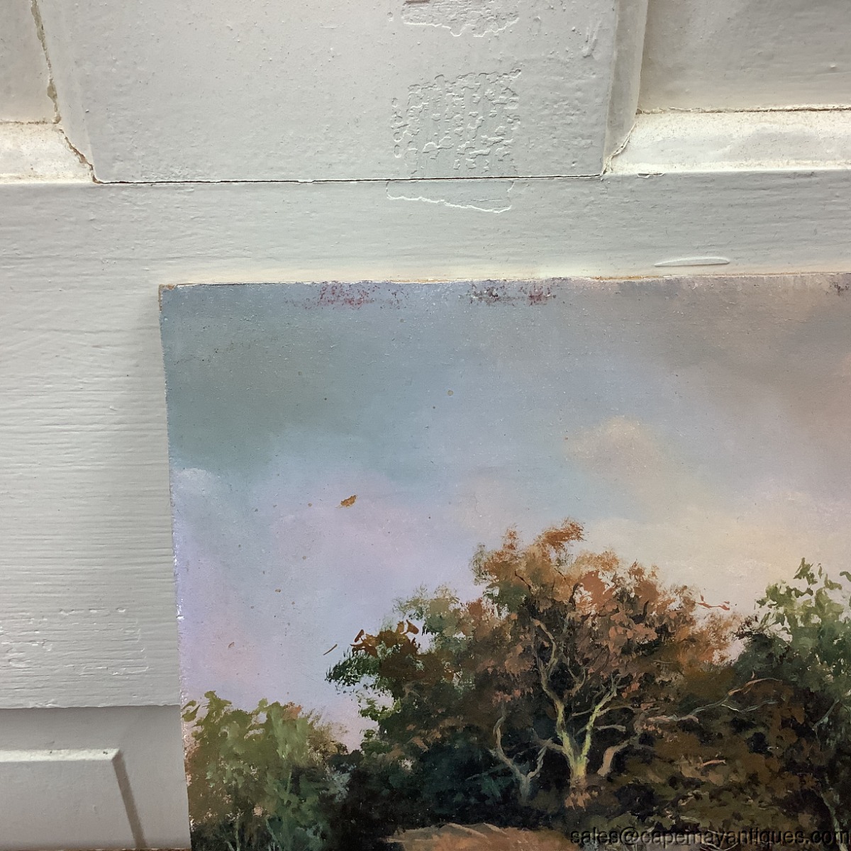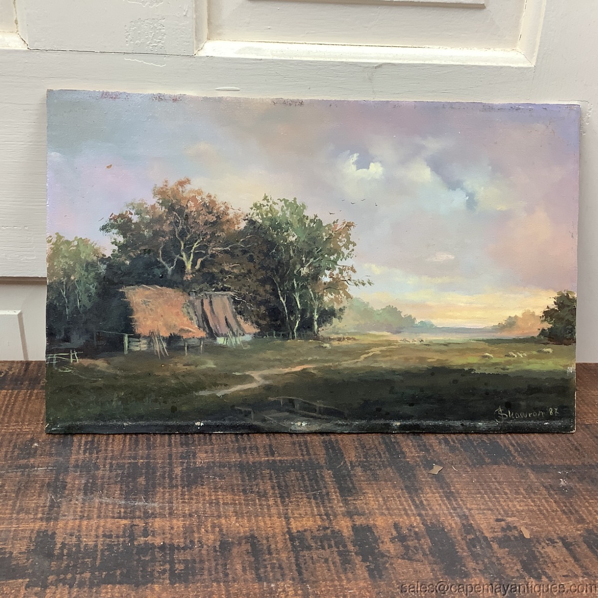 Oil Painting Landscape Dark Moody Sky Meadow Old Barns Dirt Pathway Signed