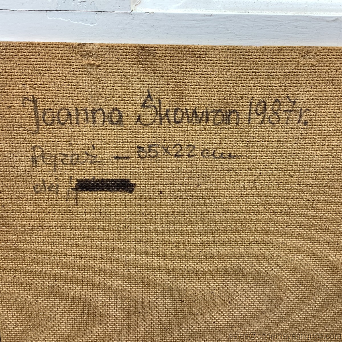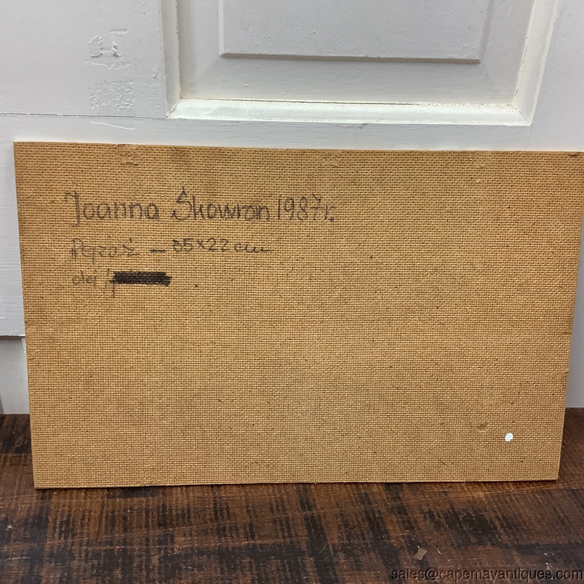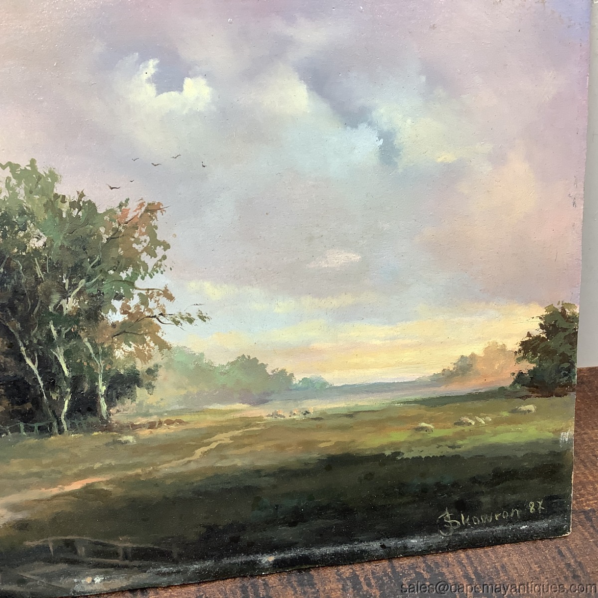 Vintage oil painting on artist board signed JoAnna Skowron 1987. She is a Polish artist. This may be a Polish landscape scene or other European scene. Measures 14" by 9". The sky is stunning with rolling clouds in various shades of blue, pastels, grey etc. Tall green trees behind the old barns with thatched roofs. Dirt path leading into the landscape further with some rocks and green lush grass, marshes. Good condition with a few minor defects, small fleck of paint missing in upper lefthand sky, some paint loss at top and bottom trims from where it was framed.