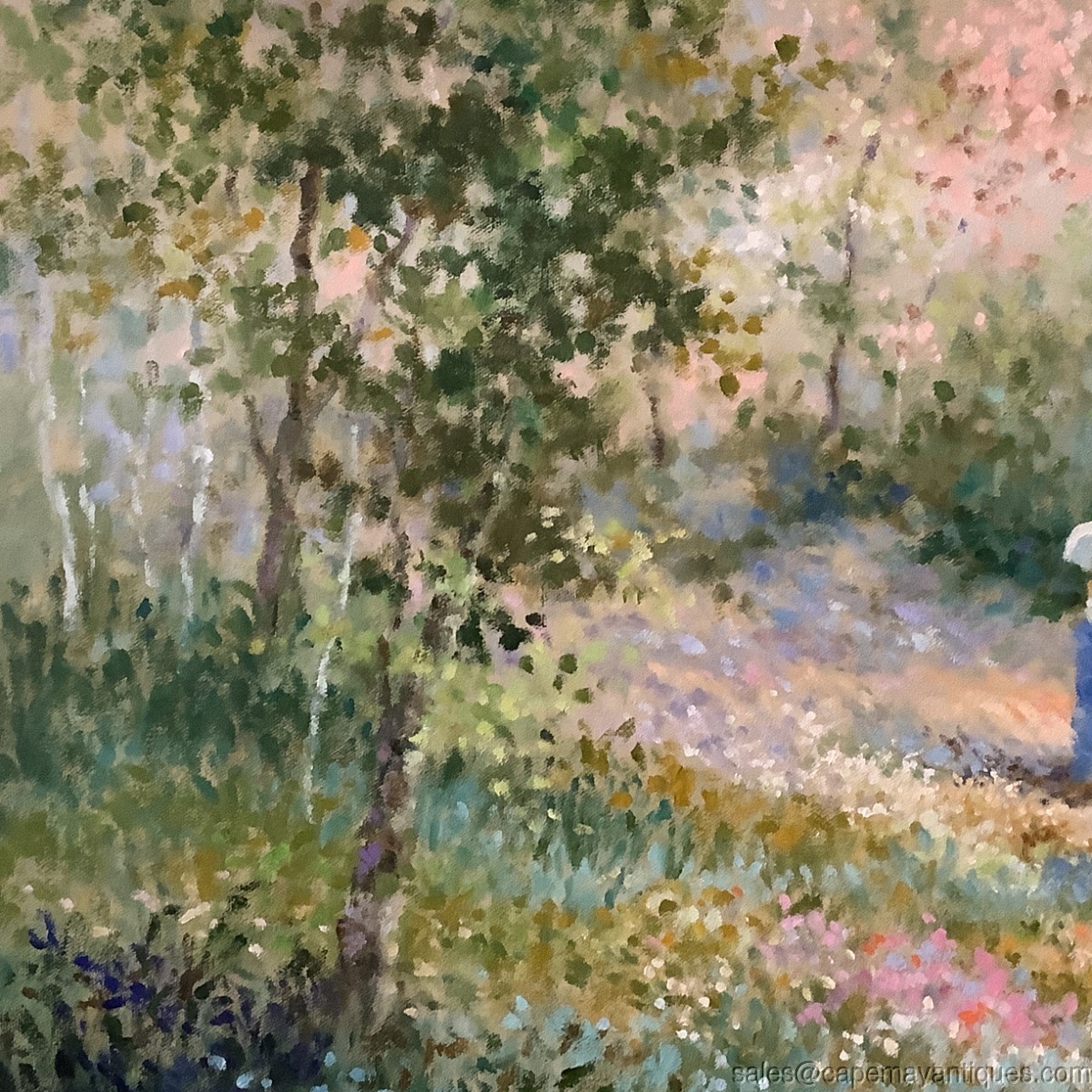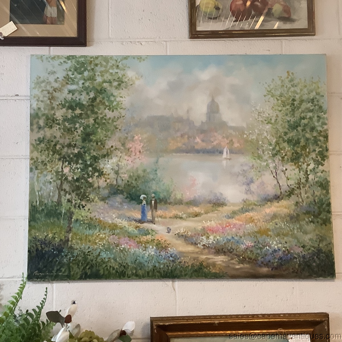 Large, lovely oil painting on canvas entitled Early Spring. The canvas is large measuring 40" by 30". Signed left hand corner. Good clean condition with no damage. Pretty pastels shades and greenery along with a couple strolling through the gardens with their small dog. In the background is a European city scape with old world buildings and domes. Very soothing, pretty oil painting. Good condition.